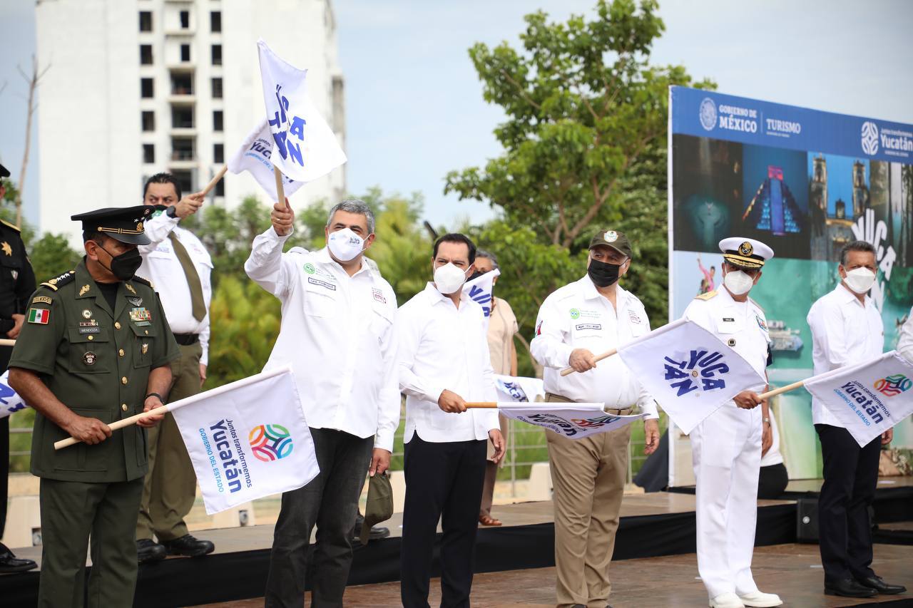 Mérida, Yucatán, 1 de julio de 2021.- Por primera ocasión, desde Yucatán, se dio el banderazo nacional del Operativo Vacacional Verano 2021, el cual estará vigente desde este día al 29 de agosto para brindar una grata estancia y contribuir a la protección de los turistas en el estado y todo territorio nacional, evento que encabezaron el Gobernador Mauricio Vila Dosal, el titular de la Secretaría de Turismo del Gobierno de México, Miguel Torruco Marqués, y el secretario general de la Organización Mundial de Turismo (OMT), Zurab Pololikashvili.
