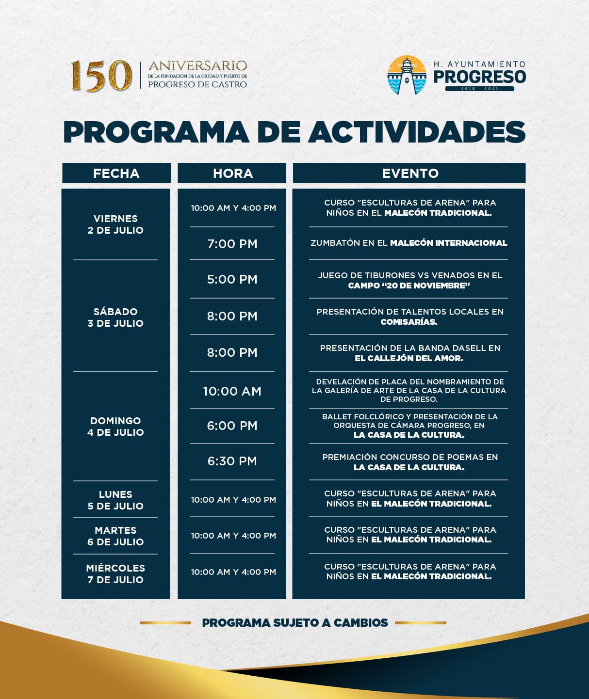 Respecto a los otros eventos, como el partido amistoso entre “Tiburones FC vs Venados FC” sigue en pie en el renovado campo “20 de noviembre” a partir de las 5 de la tarde, y la presentación de los talentos locales en las comisarías igual, en punto de las 8 de la noche.