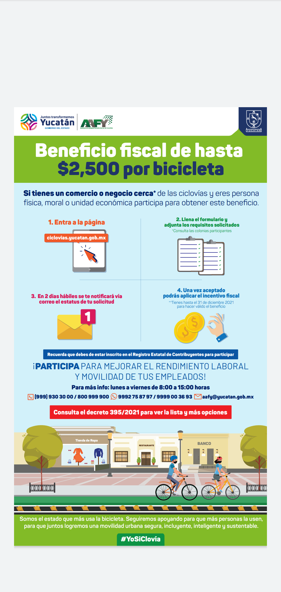De acuerdo con el Decreto 395/2021 publicado hoy en el Diario Oficial del Estado, dicho beneficio consiste en disminuir hasta el importe de 2,500 pesos del impuesto sobre la nómina por cada bicicleta adquirida para el uso del trabajador. Esta disposición entrará en vigor al día siguiente de la publicación en el Diario Oficial y estará vigente hasta el 31 de diciembre de 2021.