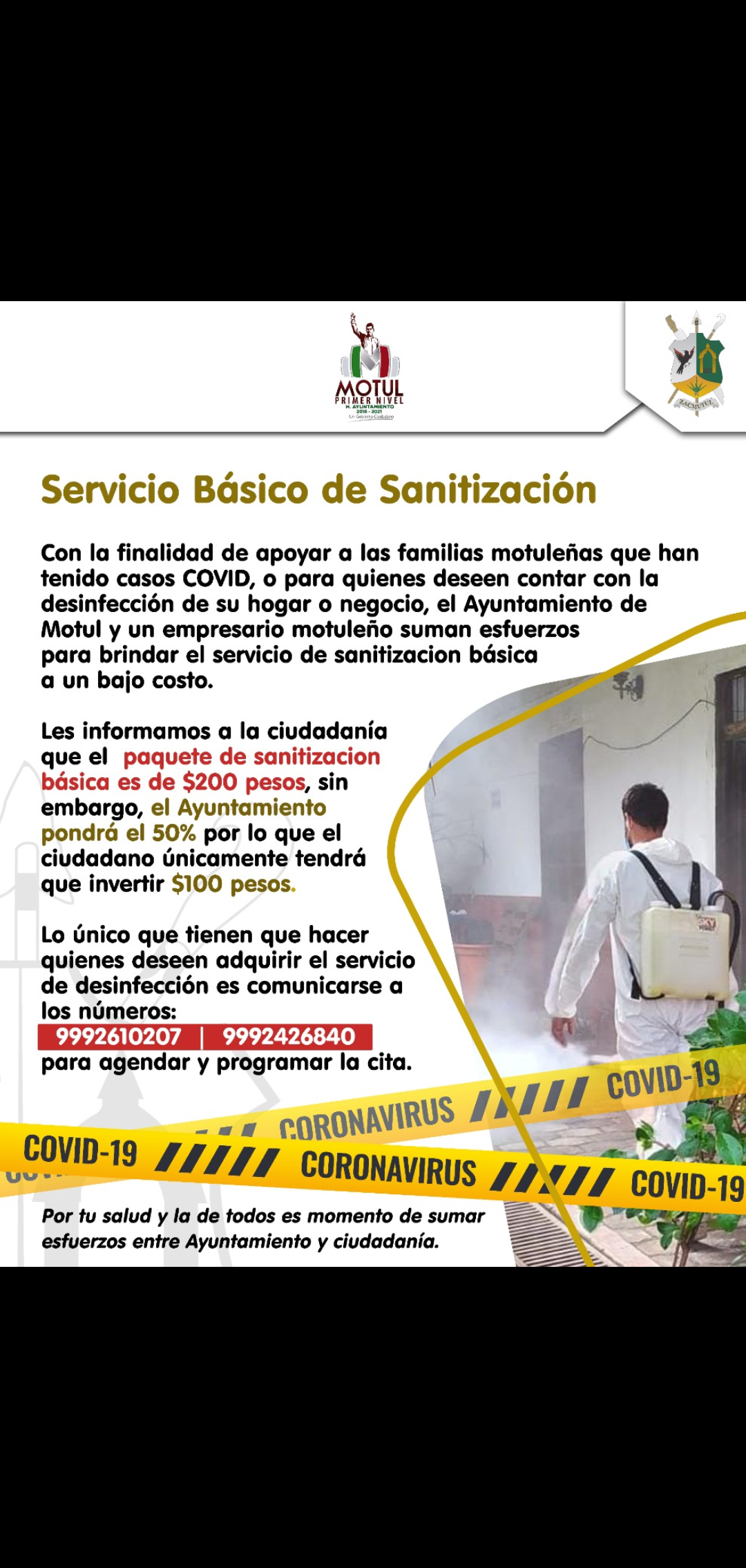 Con la finalidad de apoyar a las familias motuleñas que han tenido casos COVID, o para quienes deseen contar con la desinfección de su hogar o negocio, el Ayuntamiento de Motul y un empresario motuleño suman esfuerzos para brindar el servicio de sanitizacion básica a un bajo costo.