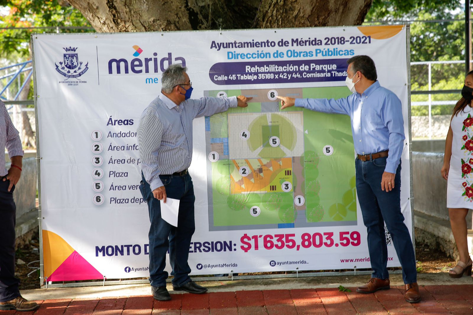 Mérida 9 de julio de 2021. El alcalde Alejandro Ruz Castro realizó esta mañana una gira de trabajo por el sur meridano para supervisar los avances en las obras que se realizan con recursos del Ramo 33 en parques de comisarías y colonias y que permitirán un mejor entorno urbano para beneficio de las familias que ahí habitan.