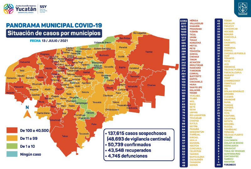 Ayer lunes 12 se inició la aplicación de primeras dosis de vacunas para personas de 30 a 39 años en Progreso, Ticul, Tekax, Tixkokob, Quintana Roo, Cuncunul, Yobaín, Telchac Puerto, Suma, Sudzal, Bokobá y Teya. Además, comenzó la aplicación de segunda dosis para personas de 40-49 y 50-59 años en Dzitás.