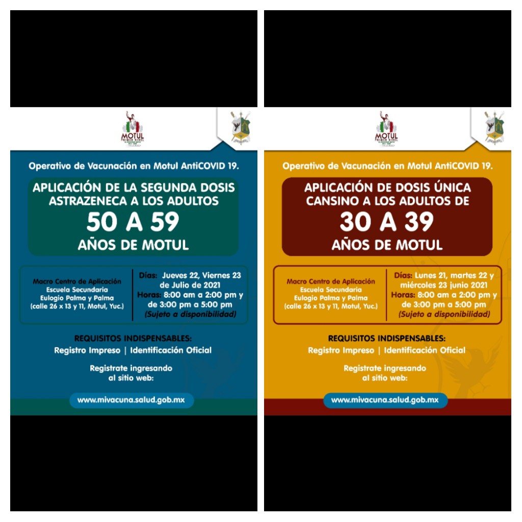 Le hacemos de su conocimiento a la ciudadanía que la Jornada de Vacunación contra el Covid-19 en Motul dará inicio el lunes 19 julio. La aplicación de la vacuna será dirigida a personas de 30 a 39 años. Asimismo, se llevará a cabo la aplicación de la segunda dosis para adultos de 50-59.