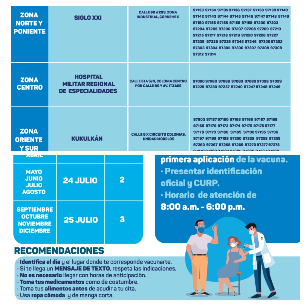 En el caso de Mérida, la SSY puntualizó que el proceso de aplicación de la segunda dosis a las personas de 50 a 59 años se estará llevando del viernes 23 al domingo 25 julio en los macrocentros habilitados en el Centro de Convenciones Yucatán Siglo XXI y la Unidad Deportiva Kukulcán, así como en el módulo del Hospital Militar Regional de Especialidades.