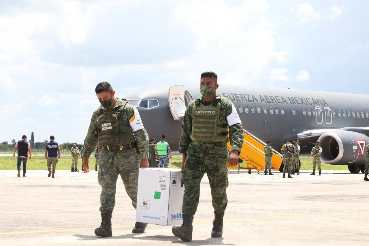 En el arribo del nuevo cargamento de vacunas también estuvo el Teniente Coronel Piloto Aviador Marco Durán García, Comandante Accidental de la BAM número 8 y el Coronel Gustavo Caratachea Esparza, comandante del 11 Batallón de Infantería.