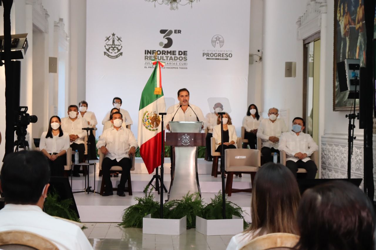 Progreso, Yucatán a 18 de agosto de 2021.- El presidente municipal de Progreso, Julián Zacarías Curi, rindió esta tarde su tercer informe de gobierno de manera virtual, esto debido a la actual pandemia por COVID-19 y en el que estuvo acompañado de integrantes de su Cabildo y del representante personal del Gobernador del Estado, Mauricio Vila Dosal, el contador público Juan Barea Canul, Director general del DIF Estatal.