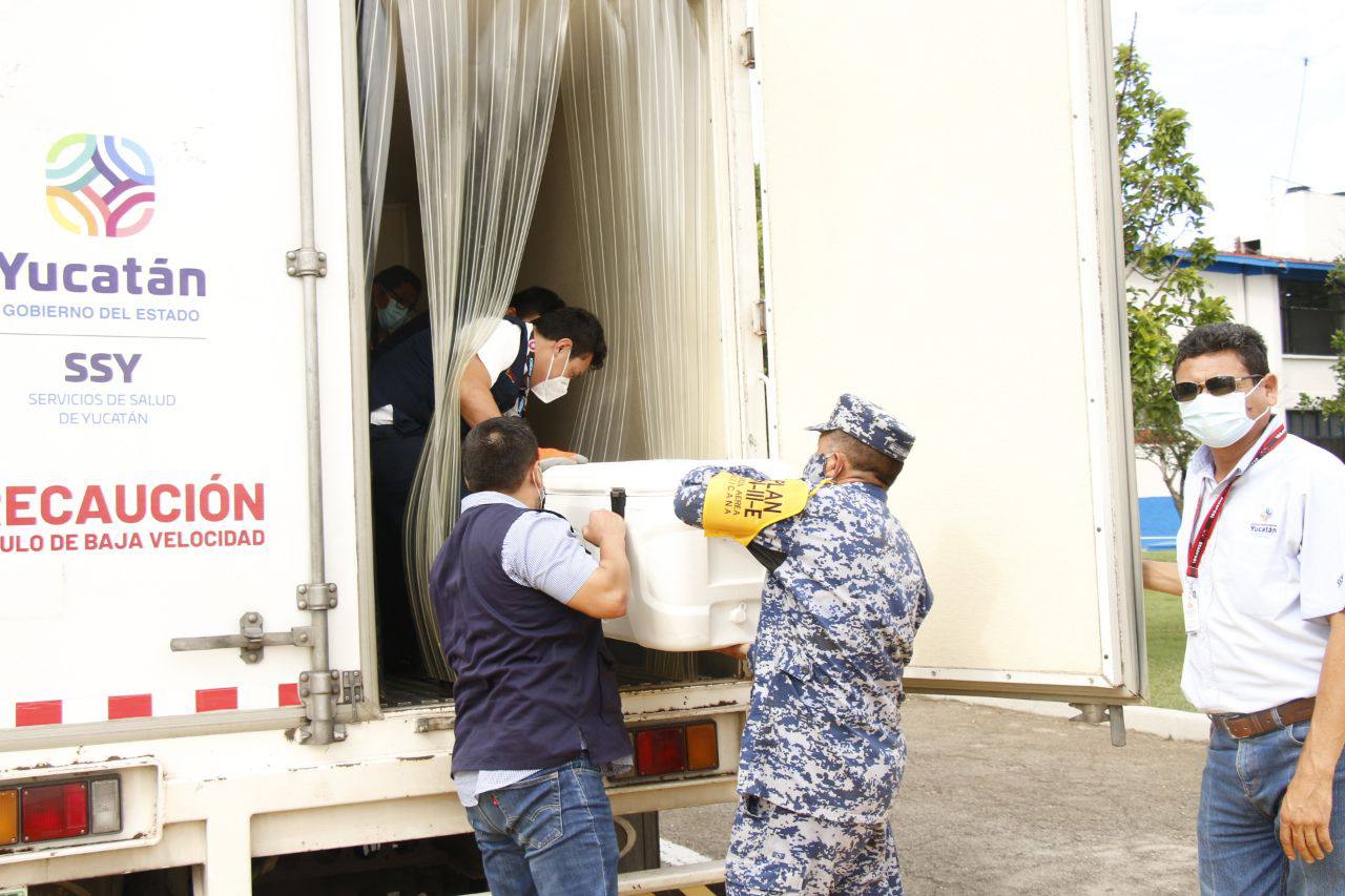 Acompañado del coordinador Estatal para la Vacunación Covid-19, capitán de Corbeta Carlos Gómez Montes de Oca, Hernández Fuentes constató la descarga del lote a cargo del personal del Ejército, el cual fue colocado en un camión thermoking de la SSY, para luego ser trasladadas al almacén estatal de vacunas, desde donde se distribuirán a los lugares donde se aplicarán.