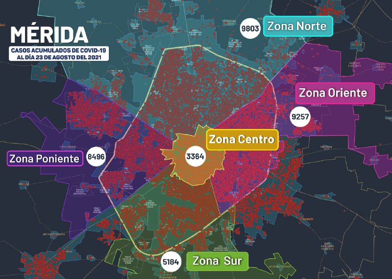Específicamente, en Mérida se han diagnosticado 36,104 personas contagiadas de Coronavirus (casos acumulados al 23 de agosto), que viven en: