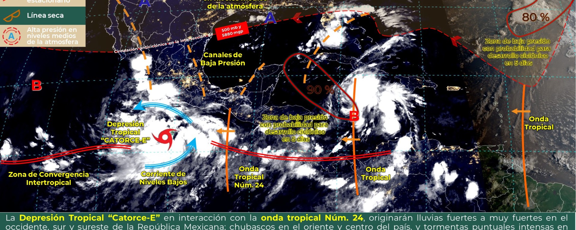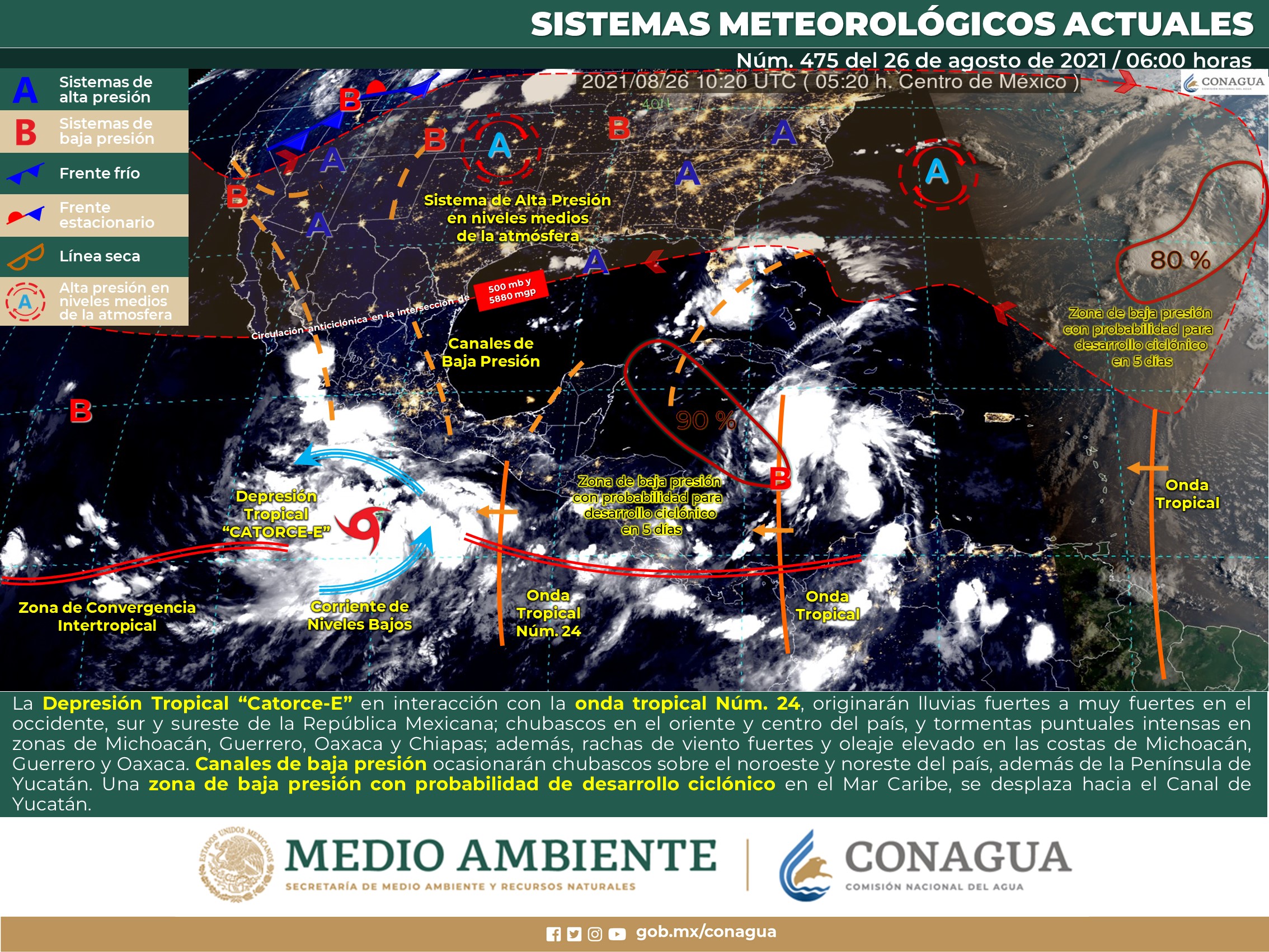 debido al ingreso de aire marítimo tropical, aunado al fuerte calentamiento diurno y la inestabilidad provocada por un vórtice en altura, por lo que en sectores del norte y centro de Quintana Roo, así como en el norte, noreste y oriente de Yucatán y la zona centro y sur de Campeche se prevén intervalos de chubascos con tormentas localmente fuertes. Las temperaturas serán calurosas a muy calurosas durante