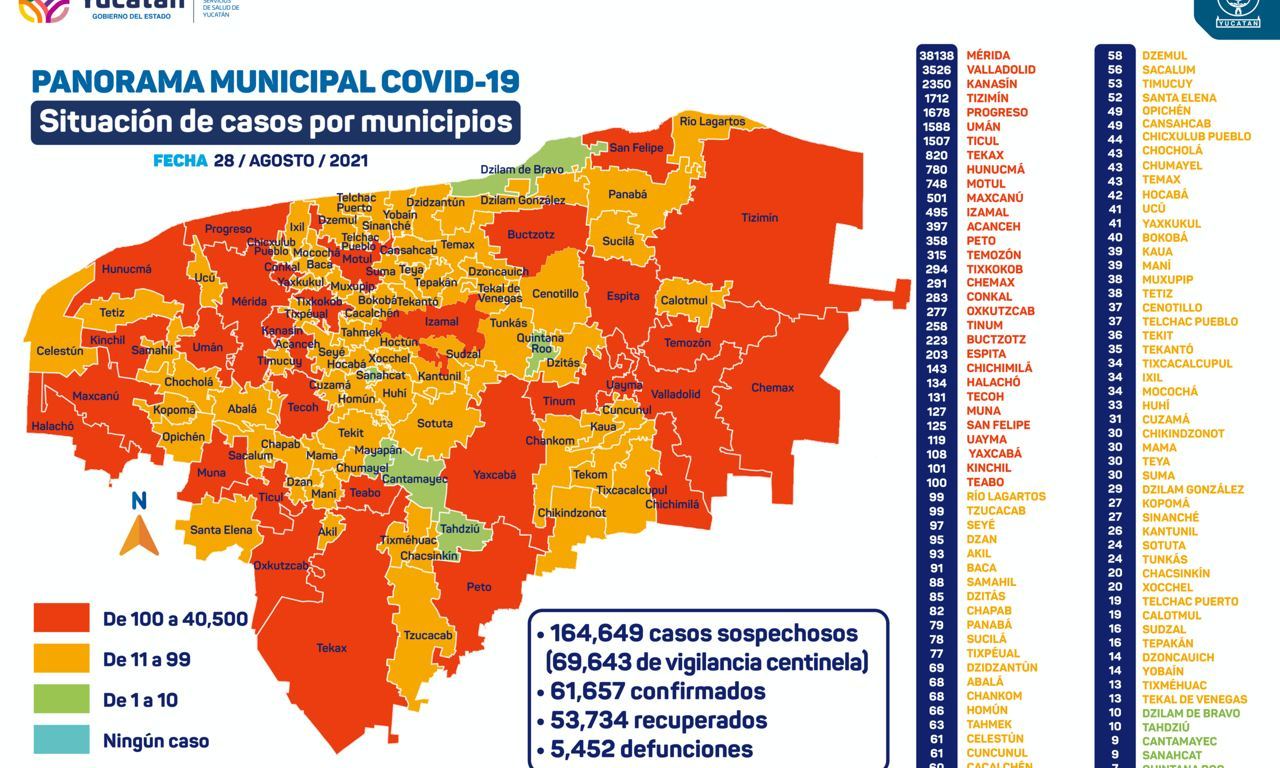 Específicamente, en Mérida se han diagnosticado 36,567 personas contagiadas de Coronavirus (casos acumulados al 27 de agosto), que viven en:
