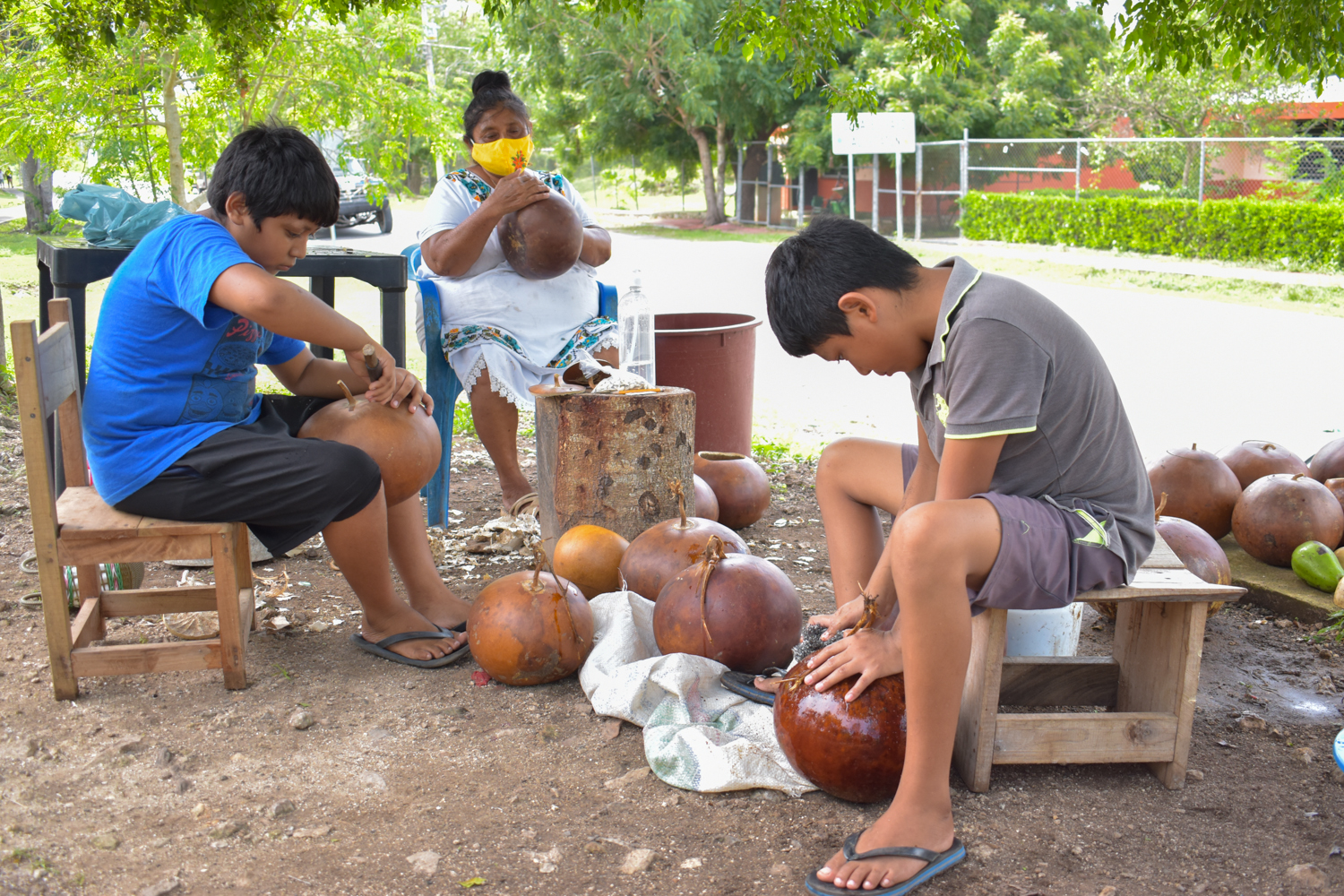 Frente a su vivienda, Sofía Moo Mex exhibe sus jícaras y leks, cuyos precios van de 10 a 100 pesos según su forma y tamaño, sobre la carretera Mérida-Tumucuy en la comisaría San Pedro Chimay. A sus 63 años, goza de energía para enseñarle el oficio a sus nietos, Manuel y Sebastián de doce años de edad, quienes la acompañan a dos metros de distancia ayudándole en esta faena.