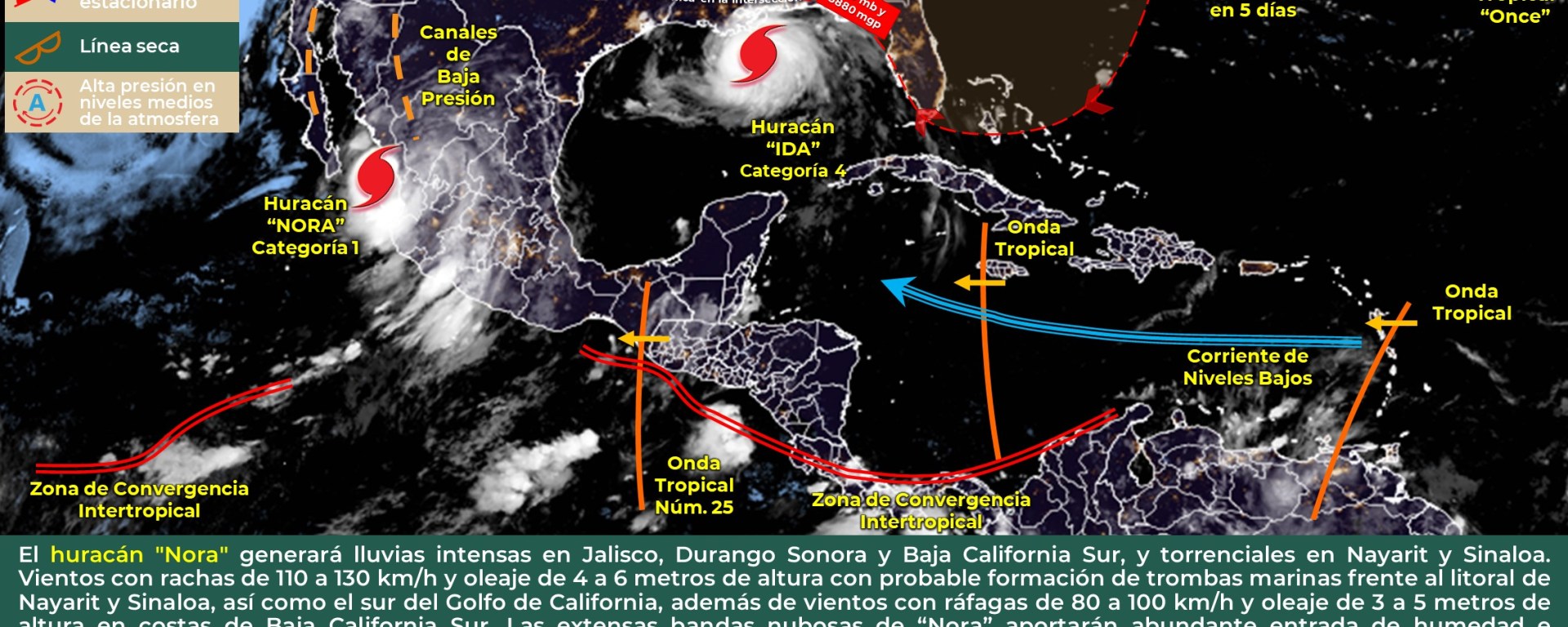 Una vaguada inducida desde niveles superiores al norte de la península de Yucatán, generada por “Ida”, favorecerá chubascos en el noroeste y norte de Yucatán, sur de Campeche, así como en el centro y sur de Quintana Roo. Asimismo, se espera ambiente caluroso durante el día y cálida por la noche, los vientos serán del sureste de 15 a 20 km/h y rachas de 40 km/h en zonas costeras.