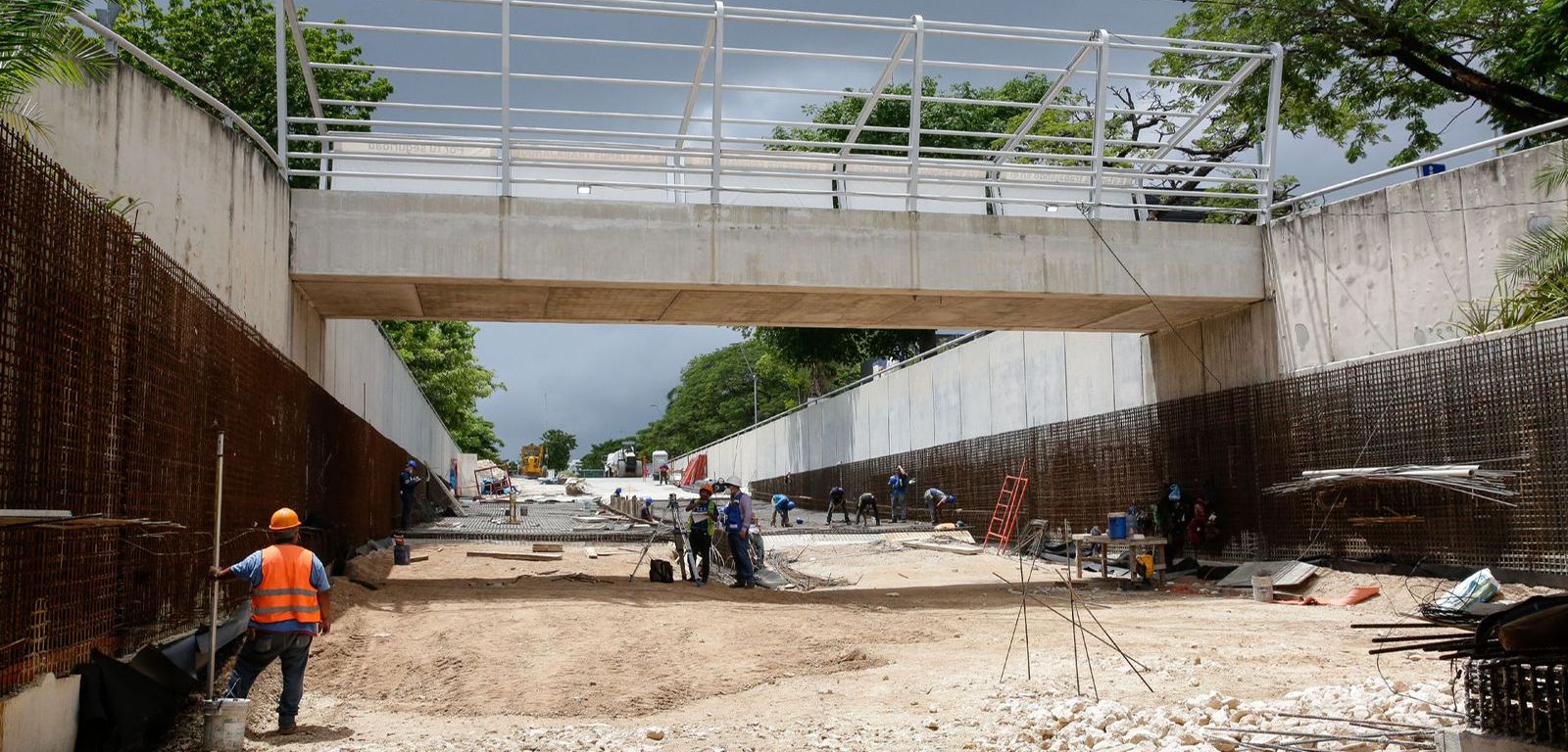 Mérida, 29 de agosto de 2021.- A pesar de las continuas lluvias registradas en los últimos días, los trabajos de rehabilitación del paso a desnivel continúan con buen avance en puntos determinantes para la obra, ya que las precipitaciones no representaron mayor problema en esta ocasión.