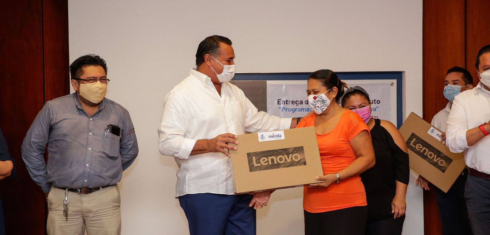 A nombre de los beneficiarios, la señora Cecilia del Carmen González González agradeció al alcalde el gesto solidario con la sociedad meridana que representa este apoyo, ya que actualmente es indispensable una computadora para que los niños y adolescentes puedan seguir en clases virtuales, privilegiado la educación, pero también el cuidado de la salud al evitar posibles contagios de Covid-19.
