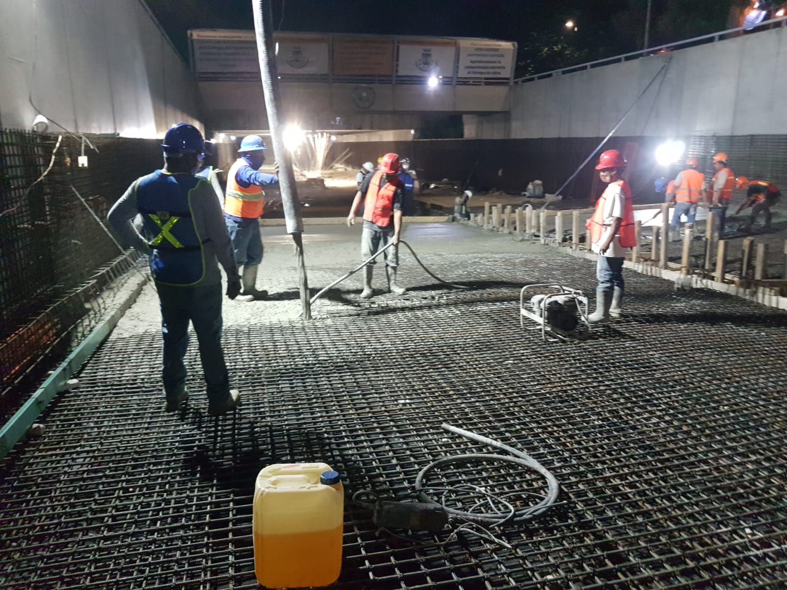 Esta semana se realizó el colado de aproximadamente 420 M2 de la rampa sur con concreto hidráulico de gran resistencia, con lo cual se alcanza la altura de la rampa de rodamiento especificada para el proyecto de rehabilitación del paso a desnivel de la avenida Prolongación Paseo de Montejo.