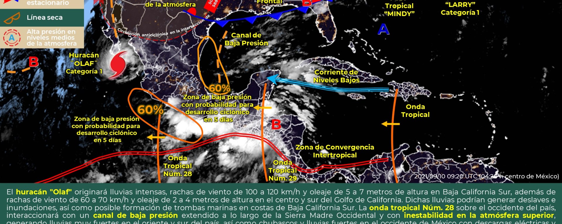 La baja presión, que se mantiene con baja probabilidad de formación ciclónica, y la onda tropical no. 29 se desplazarán hacia el sur de la península de Yucatán y sumada a una vaguada profunda al occidente de la península de Yucatán propiciarán condiciones favorables para lluvias. Se prevé que durante este día se