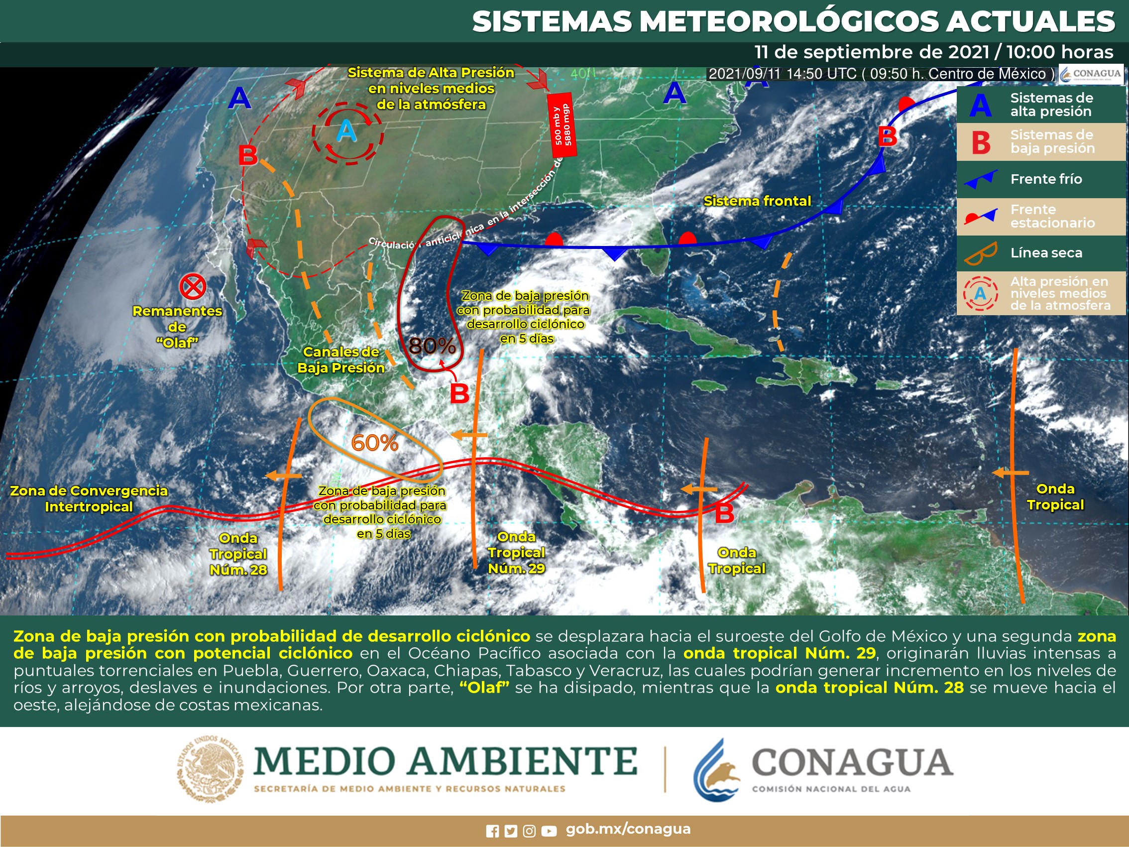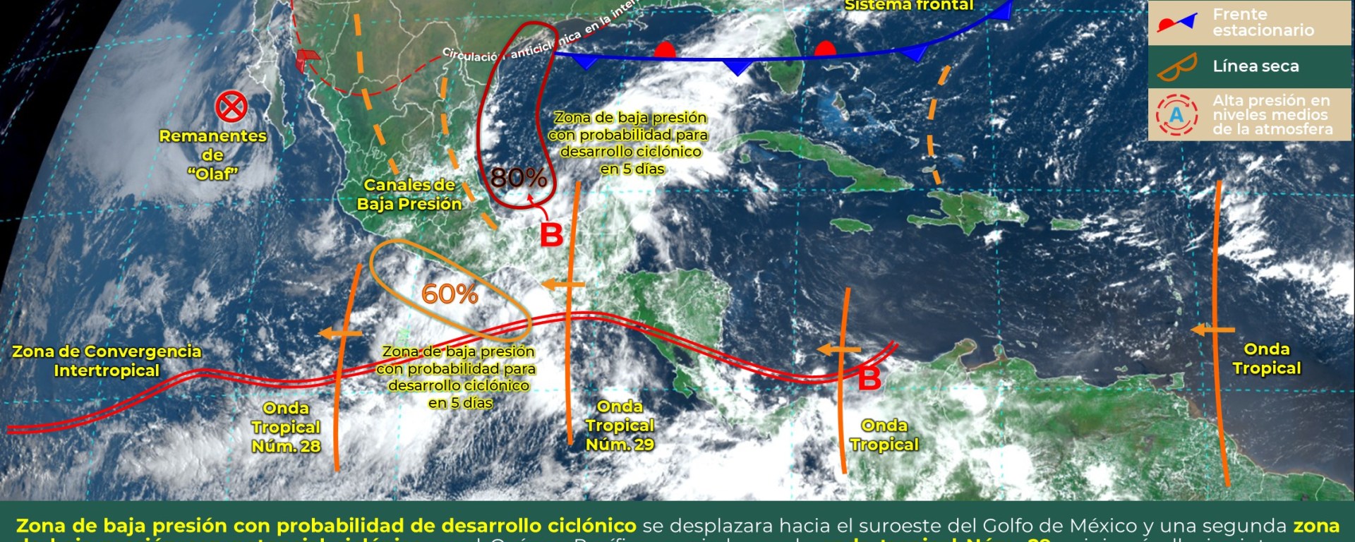 La onda tropical No. 29 al sur de la península, asociada a un sistema de baja presión con potencial ciclónico se desplazará por el suroeste de Campeche, generando una vaguada sobre el occidente de la región, mantendrán el pronóstico de lluvias fuertes a muy fuertes al norte, noroeste y sur de Yucatán, centro y sur de Quintana Roo, así como intensas en el centro y sur de Campeche. Las temperaturas serán cálidas. Viento del este-sureste cambiando al noreste de 15 a 25 km/h y rachas de 45 km/h sobre zonas costeras. En zonas de tormenta se pueden presentar rachas de viento mayor a 60 km/h, descargas eléctricas abundantes y en las costas se pueden presentar trombas marinas.