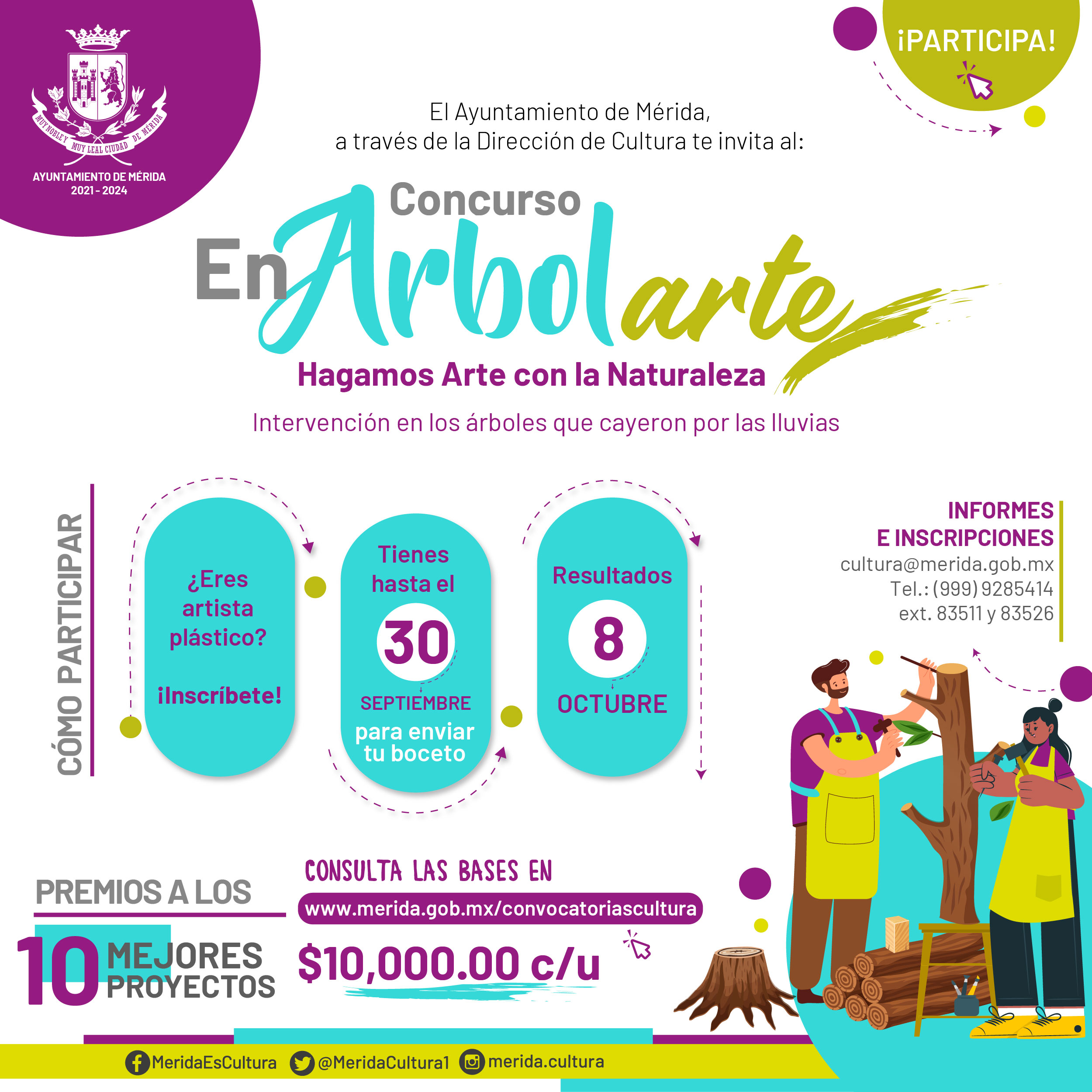 Mérida, 15 de Septiembre de 2021.- Una nueva iniciativa para fomentar la creatividad artística en la naturaleza en diferentes zonas de la Ciudad presenta el Ayuntamiento de Mérida a través de la Dirección de Cultura con el Concurso “EnArbolarte”. Se propone contribuir y colaborar, junto con las y los artistas plásticos, manteniendo la armonía y la belleza de la ciudad, mediante la intervención artística de los árboles caídos durante el paso de la tormenta “Grace”.