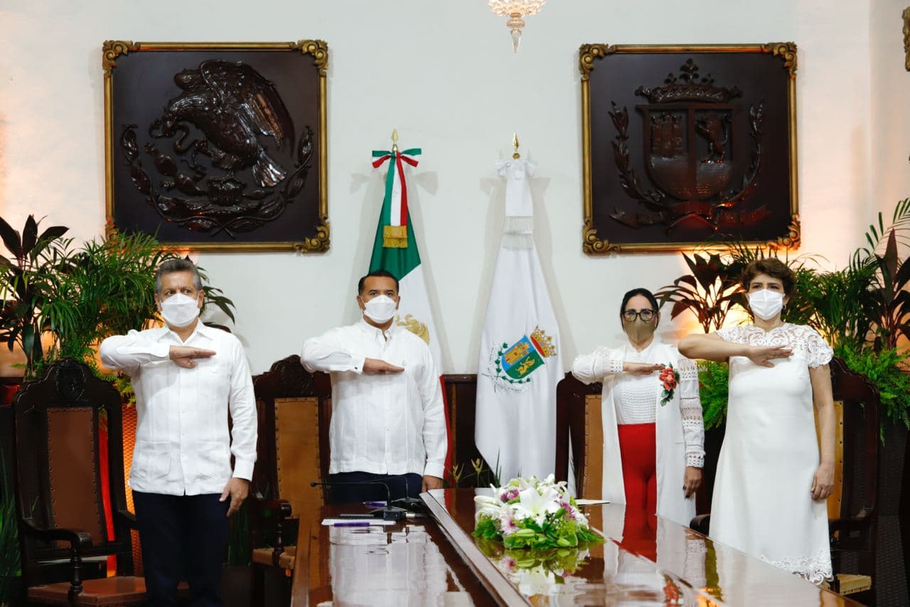 En la Sesión Solemne de Cabildo, participaron de manera virtual los representantes de diversos niveles de gobierno, titulares de cámaras empresariales y de diversas instituciones educativas y los regidores meridanos, quienes participaron con la lectura de la reseña del aniversario del inicio de la independencia y la presentación de la Oradora Huésped.