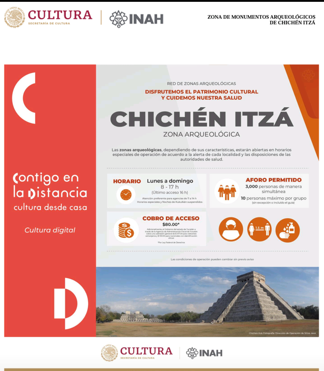 Se hace del conocimiento público, que en base al Lineamiento general para la mitigación y prevención de COVID-19 en espacios públicos abiertos, publicado por la Secretaria de Salud en la página coronavirus.gob.mx, y de acuerdo al semáforo epidemiológico en que se encuentra actualmente el Estado de Yucatán, el cual es de color Naranja, la Zona de Monumentos Arqueológicos de Chichén Itzá permanecerá cerrada el día 22 de septiembre del presente año, como una medida preventiva para evitar la propagación del virus SARS-CoV-2.