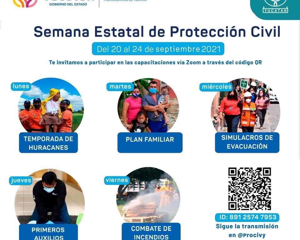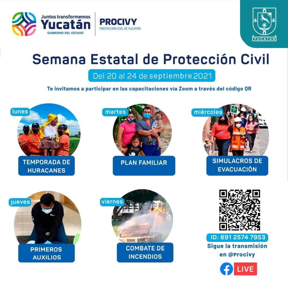 Mérida, Yucatán, 18 de septiembre de 2021.- Con el propósito de saber qué hacer o cuáles medidas adoptar en caso de huracán, incendio u otra eventualidad, que ponga en riesgo a personas o bienes, la Coordinación Estatal de Protección Civil (Procivy) convocó a la población en general a participar en los talleres de capacitación en línea, del 20 al 24 del presente mes.