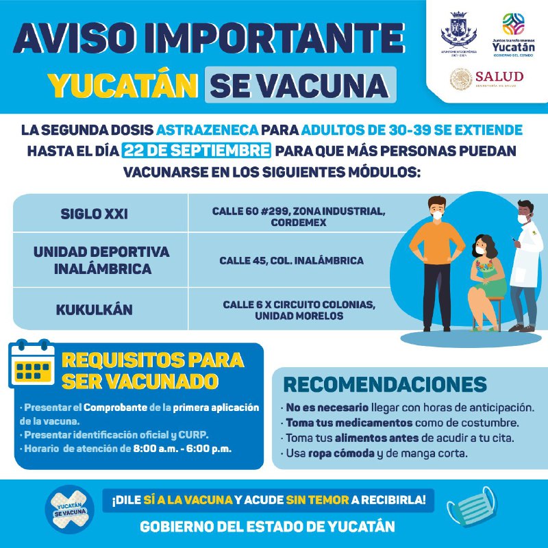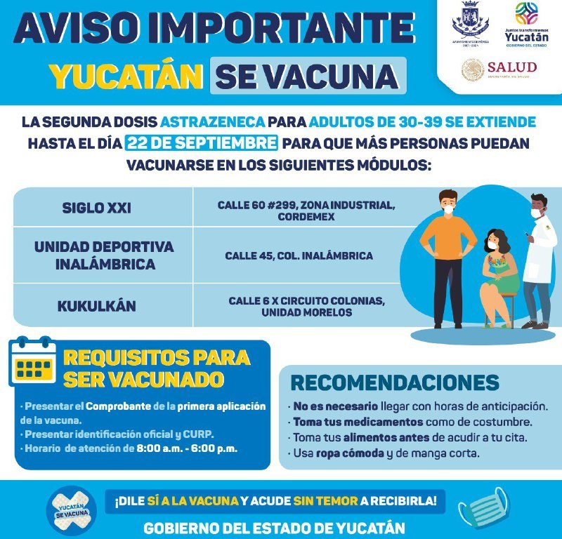 Mérida, Yucatán, 21 de septiembre de 2021.- La aplicación de la segunda dosis de la vacuna contra el Coronavirus a las personas de entre 30 y 39 años en Mérida se amplía hasta mañana miércoles 22 de septiembre, proceso que desarrollarán de manera coordinada el Gobierno del Estado, el Ayuntamiento de Mérida y la Secretaría de Bienestar.