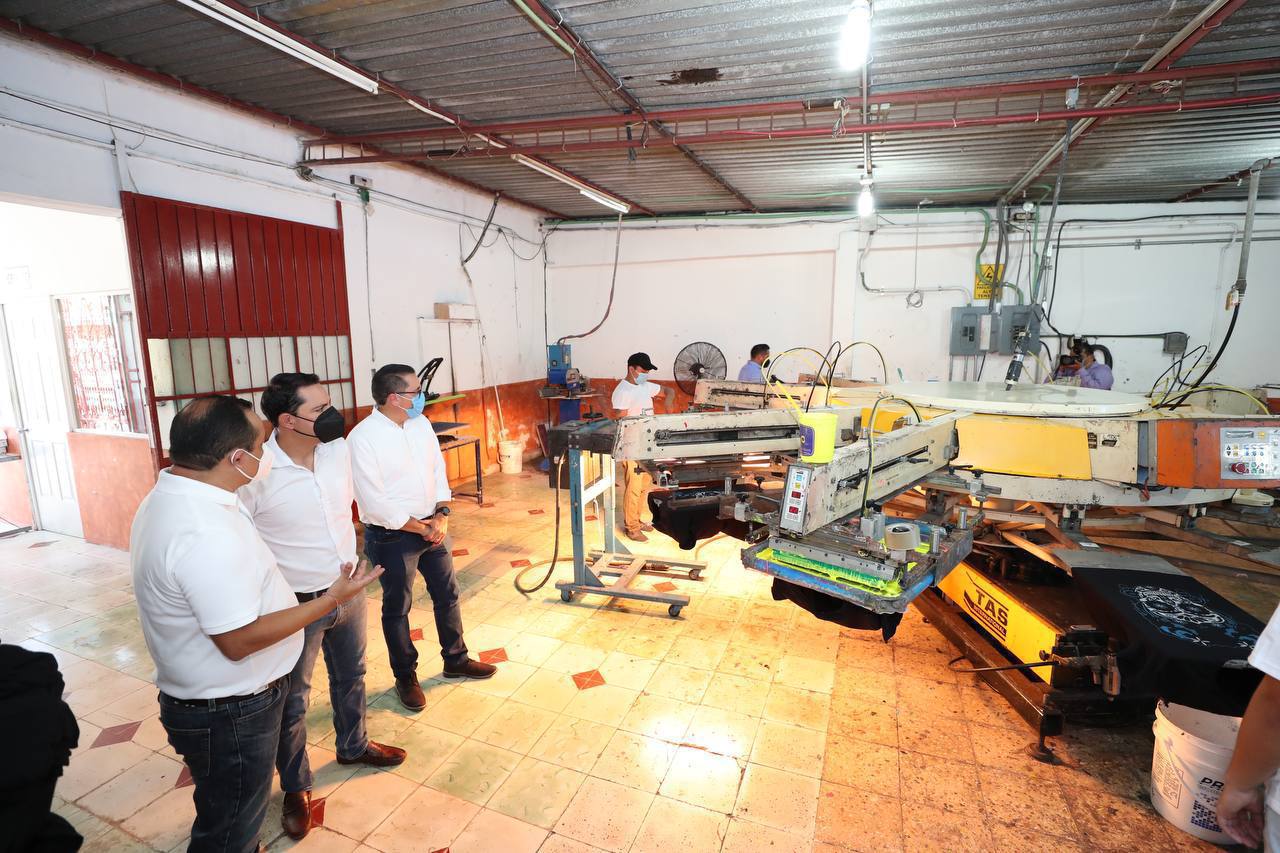 Acompañado del presidente de la Junta de Gobierno y Coordinación Política del Congreso del Estado, Víctor Hugo Lozano Poveda, el Gobernador realizó un recorrido por el área de producción del sitio, donde los trabajadores, que son oriundos de Mérida, su comisaría de Cholul y el municipio de Conkal, estaban realizando serigrafía en playeras y material para bolsas.
