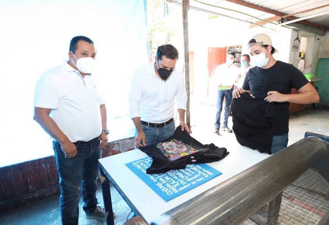 La jornada laboral transcurría con normalidad en el taller de serigrafía y textiles «2BPrinting», propiedad de Armando y ubicado en la comisaría meridana de Cholul, cuando hasta las puertas del negocio se presentó Vila Dosal, quien acudió para conocer la labor que aquí se realiza y platicar con el empresario, sobre cómo le ha ayudado este apoyo para enfrentar los estragos de la emergencia sanitaria, el cual le ha permitido incrementar su plantilla de trabajadores, pasando de 5 a 11 colaboradores.