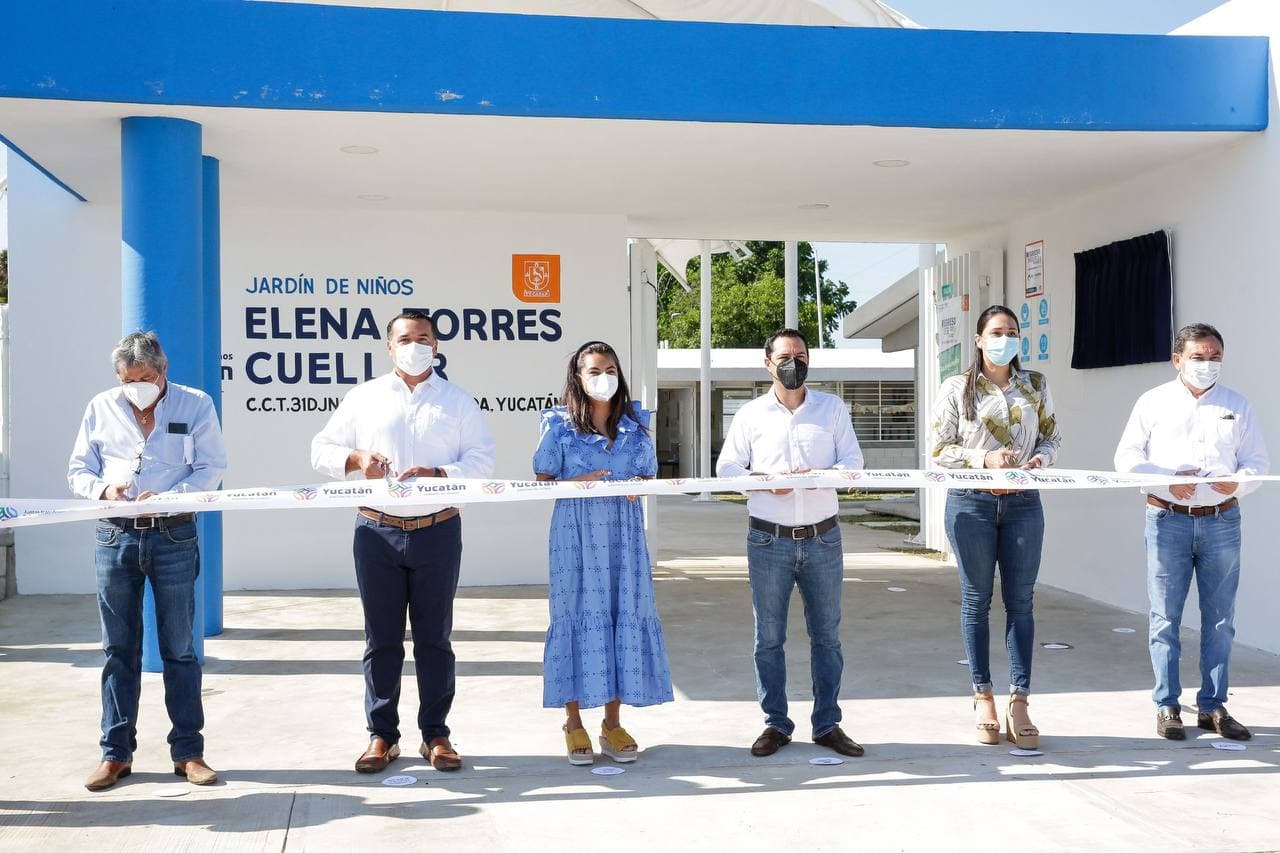 Posteriormente, Vila Dosal entregó el preescolar “Elena Torres Cuéllar”, el cual cuenta con una matrícula de 75 alumnos, 3 aulas didácticas, dirección, pórtico, plaza cívica con domo tipo lonaria, zona de juegos y baños con espacios para niños con discapacidad motriz que requieran sillas de ruedas, y una alarma conectada a la dirección, en caso de que alguien requiera ayuda y dar aviso, lo cual verificó durante su recorrido. La construcción de este plantel significó una inversión de 4.3 millones de pesos.