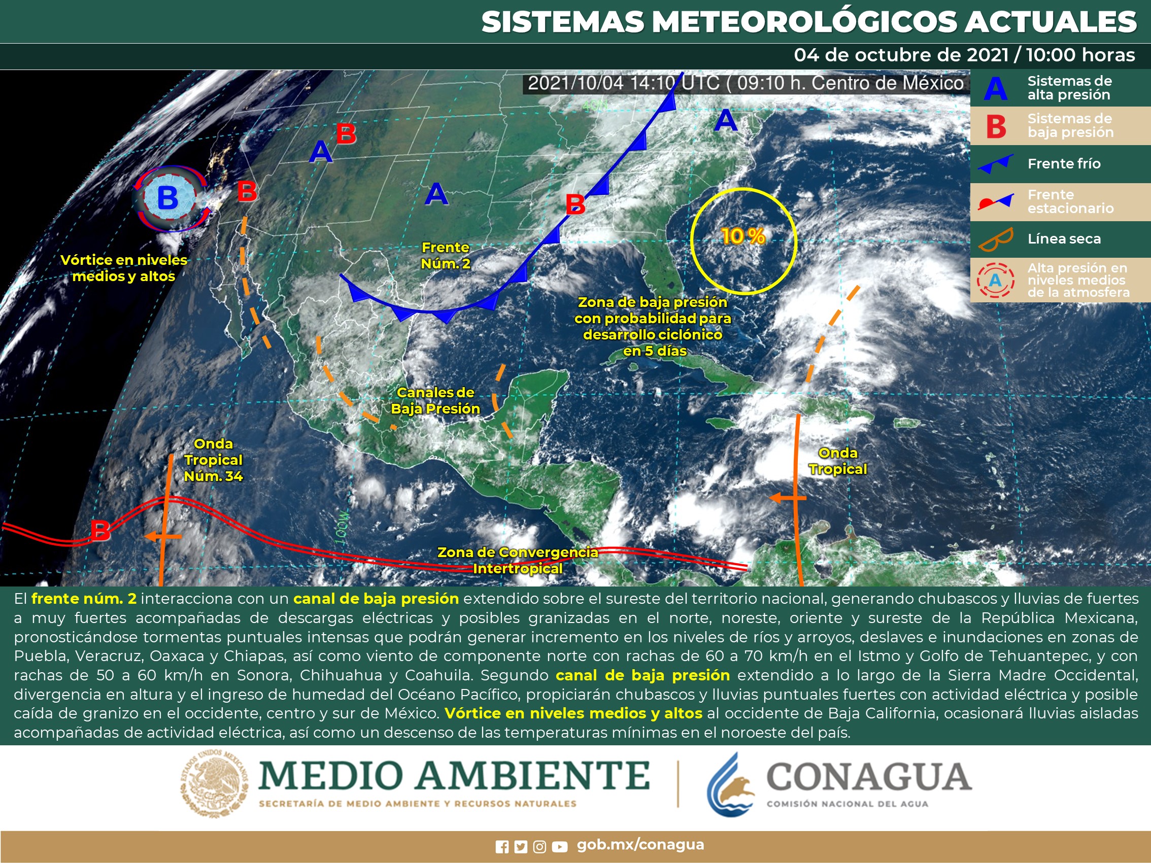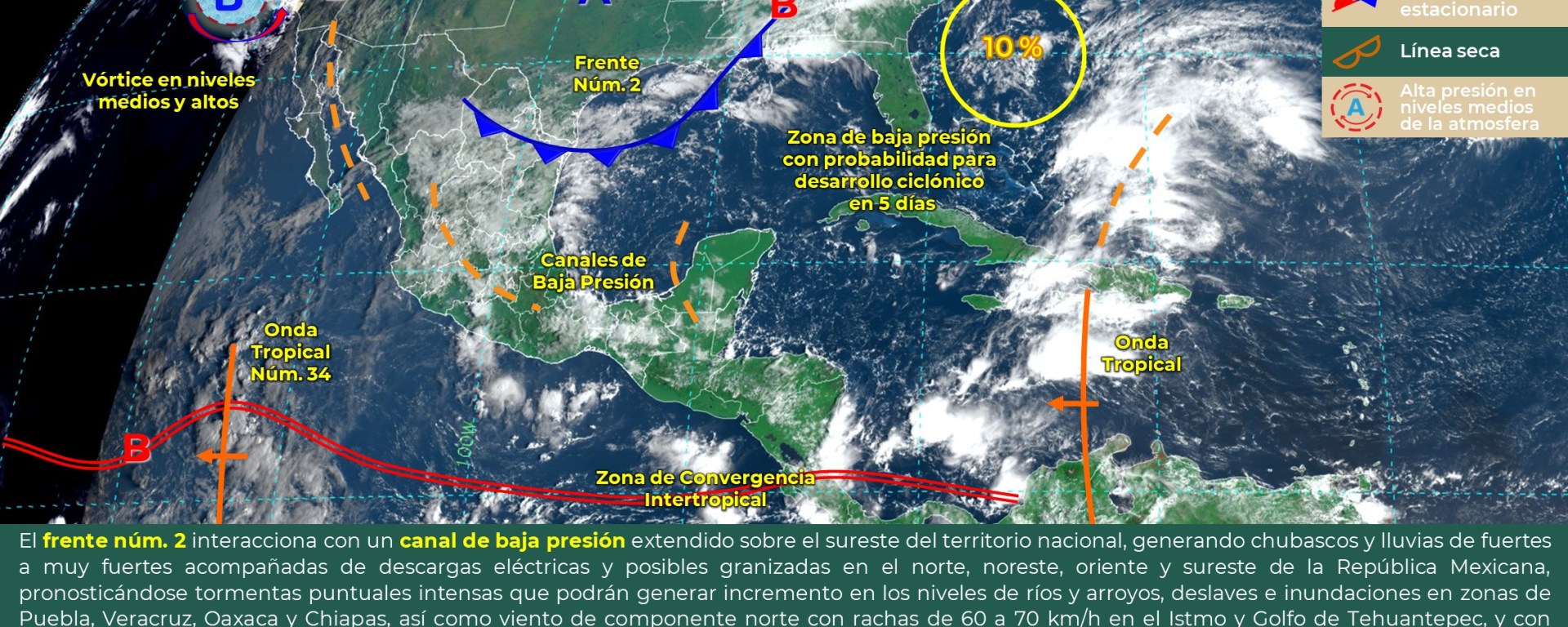 ocasionarán probabilidad para intervalos de chubascos con tormentas en el norte y sur de Quintana Roo, así como chubascos con tormentas puntuales fuertes en el sur y centro de los estados de Yucatán y Campeche. Las temperaturas serán calurosas a muy calurosas en el día y cálidas en la noche, con viento del este-sureste cambiando al noreste de 15 a 25 km/h y rachas de 40 km/h sobre la zona costera de Yucatán y Campeche.