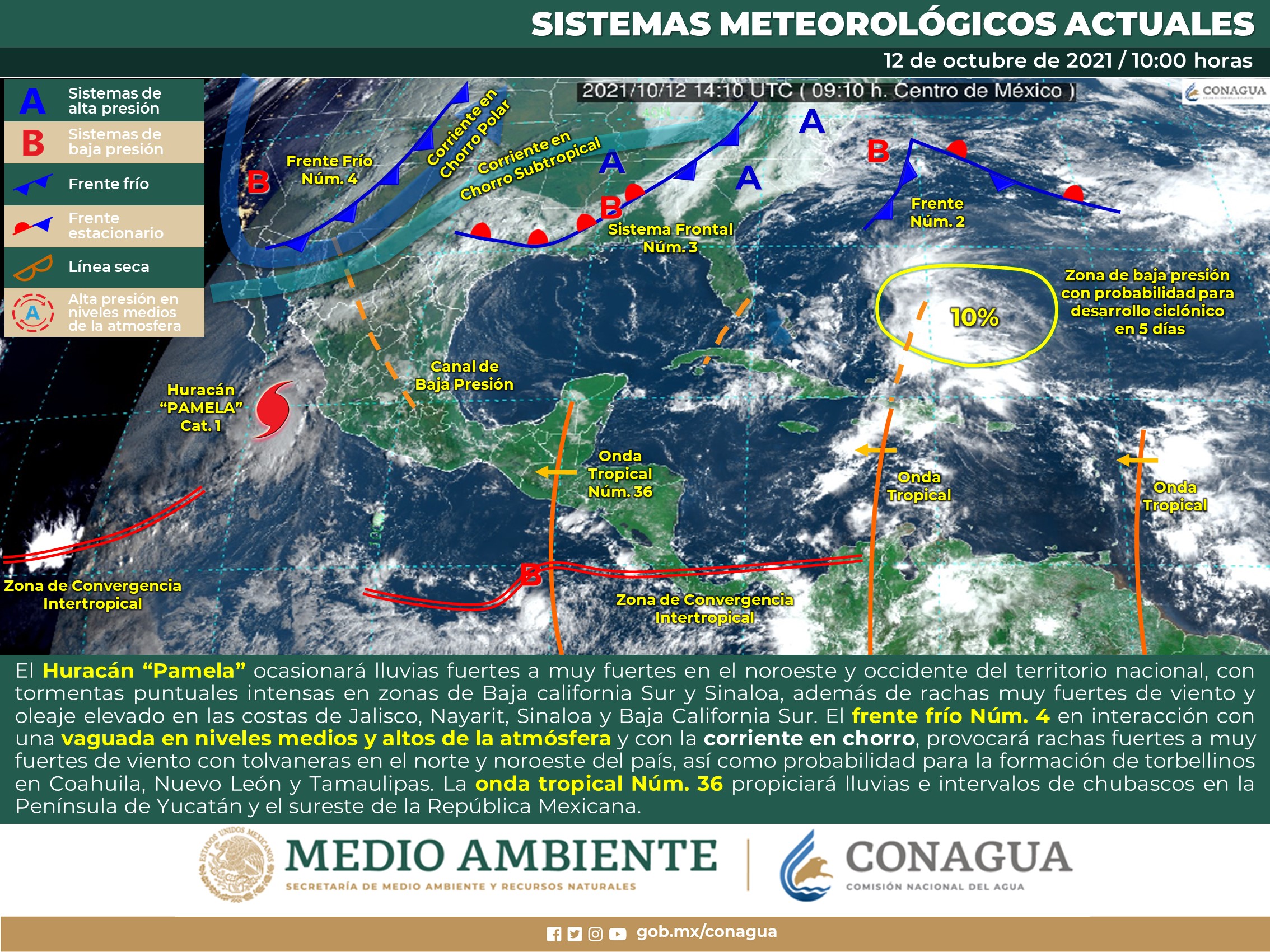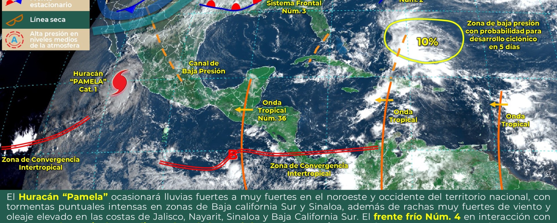 Debido al aporte de humedad asociado al paso de la onda tropical No.36 al sur de la península de Yucatán, se prevén condiciones de cielo medio nublado, con probabilidad para intervalos de chubascos principalmente en el centro y sur de Quintana Roo y sur de Campeche, así como