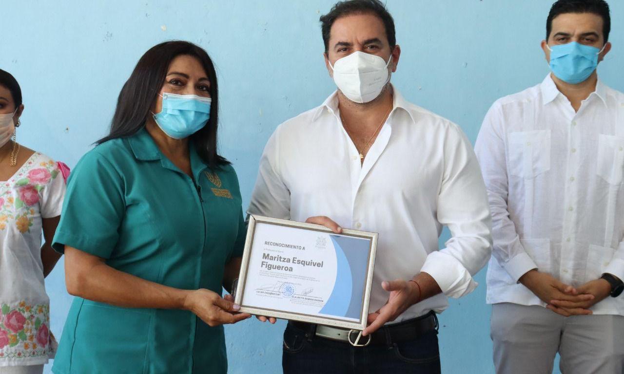 La titular del IMM, María Mercedes Arjona Euán recibió al edil en el comisariado ejidal, en donde también estuvo presente el diputado del IX Distrito Local, Erik Rihani Gónzalez, así como los regidores Claudette Gamboa Rassam, y el Regidor Herbert Pech Baquedano.