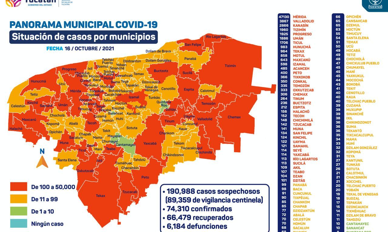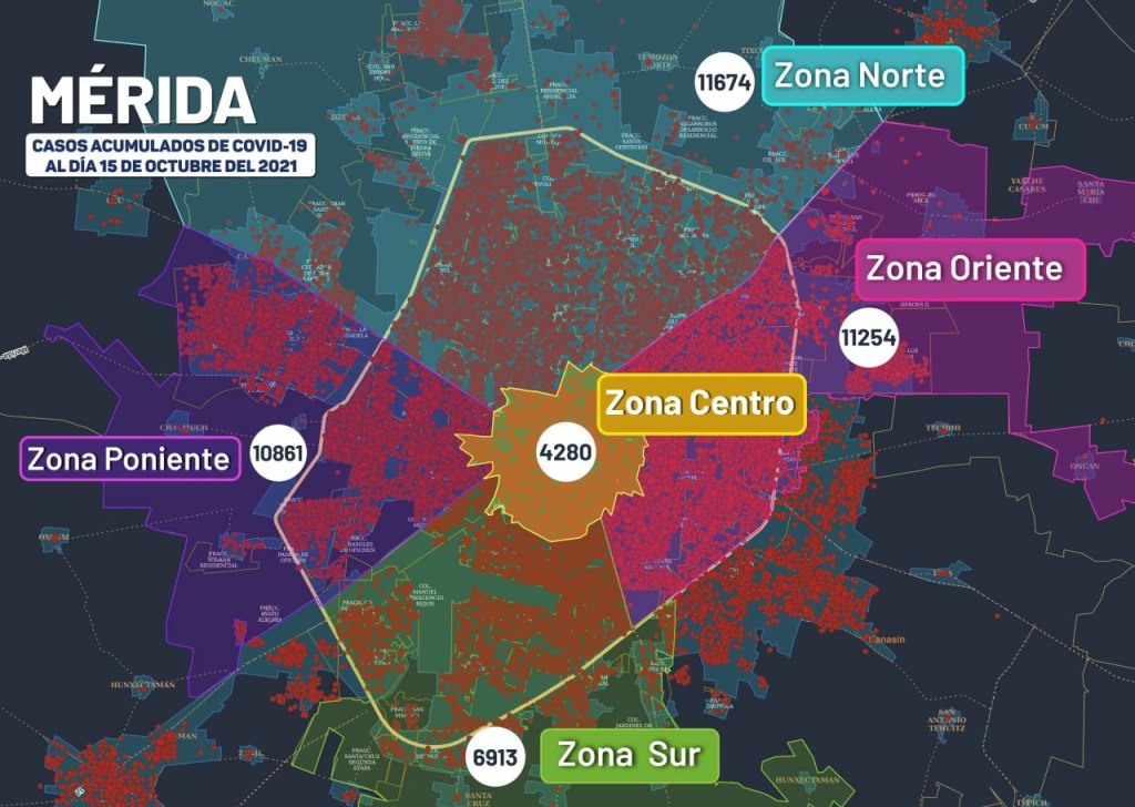 Específicamente, en Mérida se han diagnosticado 44,982 personas contagiadas de Coronavirus (casos acumulados al 15 de octubre), que viven en: