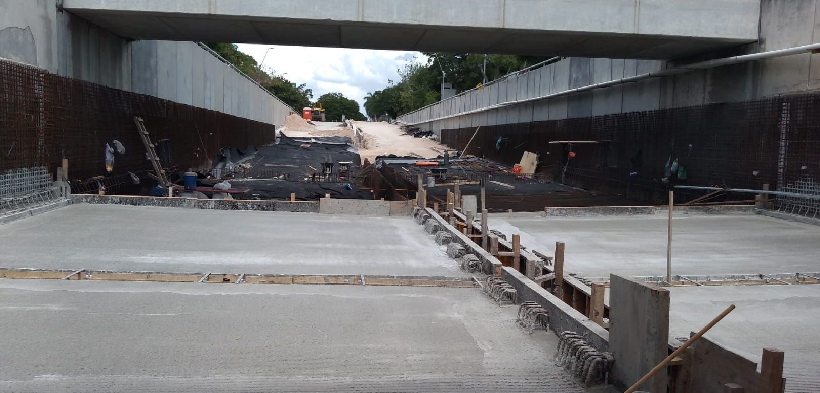 En la zona conocida como el túnel ya se colaron 630 metros cuadrados de concreto hidráulico de alta resistencia, para formar la superficie de rodamiento y alcanzar la altura determinada en el proyecto de rehabilitación del paso a desnivel, este colado se realizó sobre el armado de acero y la envoltura de material pétreo con la geo-malla colocada sobre el piedraplen y sobre la nueva cisterna hermética.