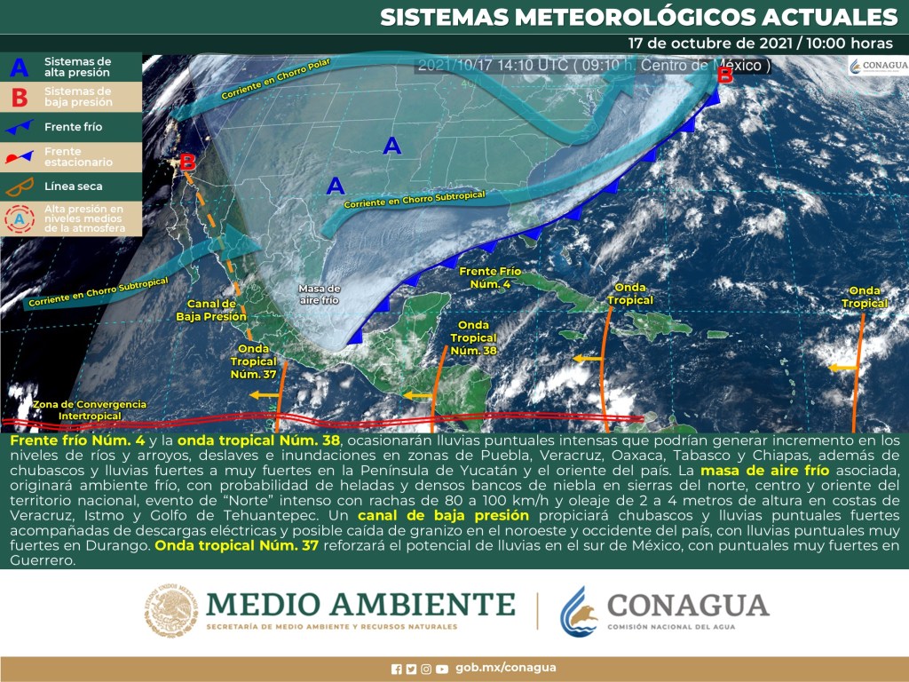 La cercanía del frente frío No.4 al occidente de la península de Yucatán, estará induciendo una vaguada sobre la región, dejando tormentas fuertes en el noroeste, centro y noreste de Yucatán, norte y sur de Quintana Roo, así como muy fuertes en el centro y suroeste de Campeche. Las temperaturas serán calurosas a muy calurosas en el día y cálidas durante la noche. Viento del este-noreste de 15 a 20 km/h y rachas de 40 km/h en zonas costeras.
