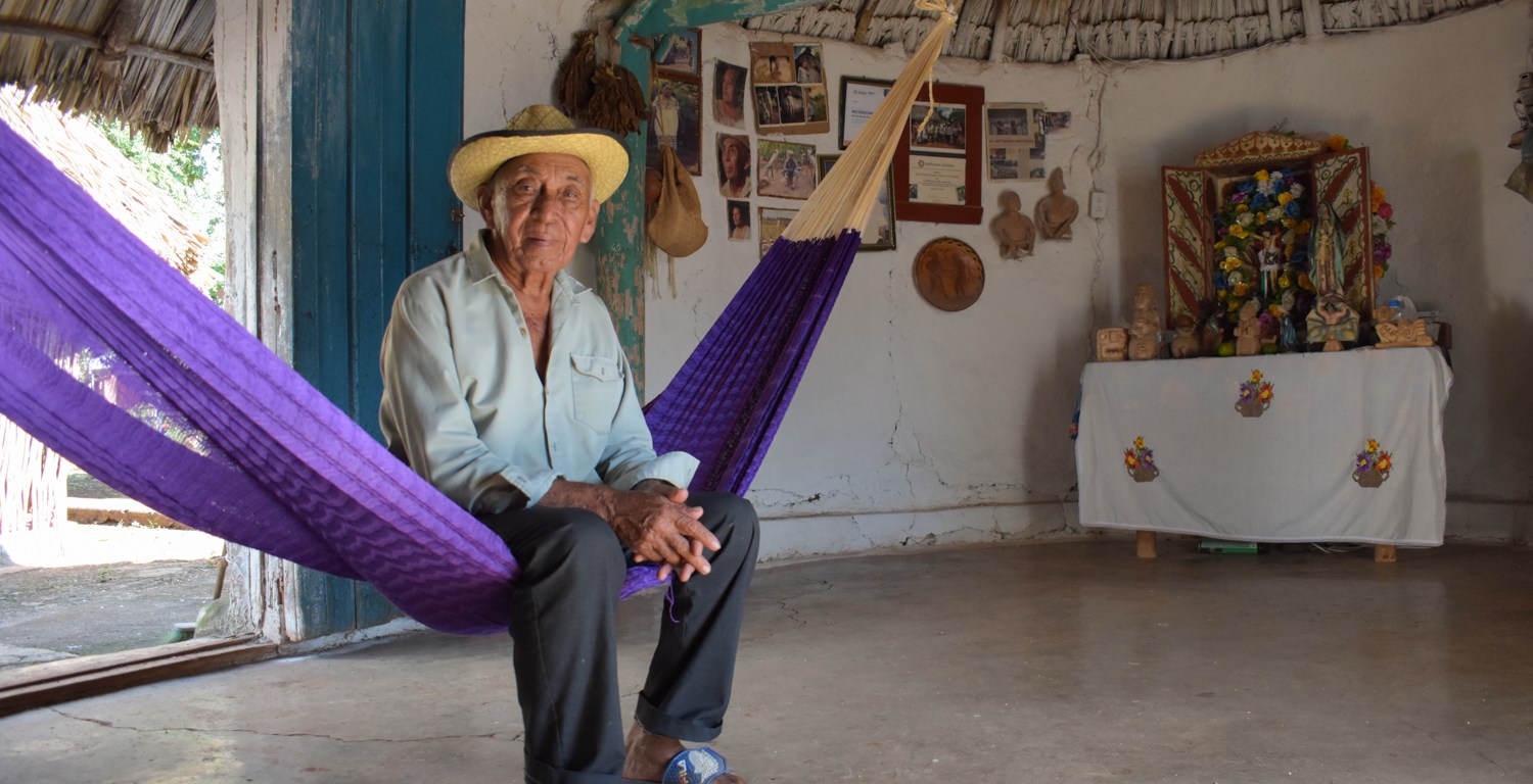 A pesar de sus 84 años de edad, el anfitrión se incorpora con agilidad para recibir con una amplia sonrisa a todo aquél que cruza el umbral, gustoso de compartir los saberes constructivos transmitidos por generaciones desde hace unos tres mil años. Él heredó los conocimientos de su abuelo Cristóbal, nacido en 1840, quien le enseñó a utilizar materiales disponibles en el entorno como bejuco, tierra, zacate, palma de huano y maderas como el ja’bin o chulúul, óptimas para estos menesteres.