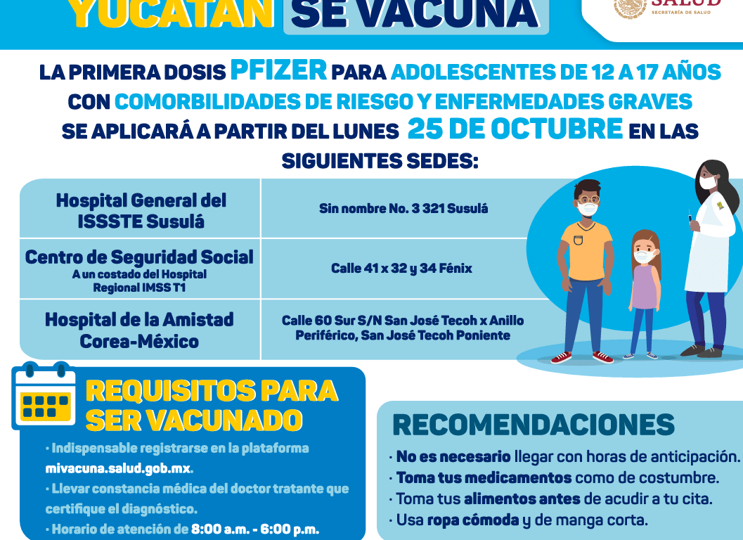 Mérida, Yucatán, 19 de octubre de 2021.- A partir del próximo lunes 25 de octubre iniciará en Mérida la aplicación de la primera dosis de la vacuna contra el Coronavirus para adolescentes de 12 a 17 años de edad con comorbilidades de riesgo y enfermedades graves, proceso que realizarán de manera coordinada el Gobierno del Estado, el Ayuntamiento de Mérida y la Secretaría del Bienestar.