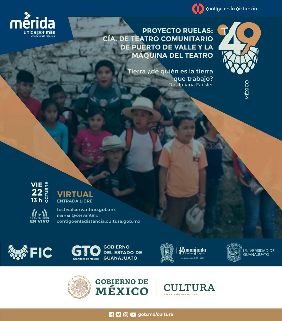 Por otro lado, la ventana cultural del Festival Internacional del Cervantino continúa con las transmisiones virtuales que se pueden disfrutar desde la página de facebook Mérida es Cultura, hasta el 31 de octubre. Este fin de semana se presentan obras de las compañías Proyecto Ruelas: Compañía de Teatro Comunitaria de Puerto de Valle y la Máquina de teatro” (de México), Chico César (Brasil), Vita Set (Argentina), Liberato Kani (Perú) y Cuarteto Solar y Tania Ugalde, versión con sexteto de cuerdas (México). Entre semana las funciones se proyectan a las 7 de la noche y sábados y domingos, se agrega una más a la 1 de la tarde. La programación completa se puede consultar en festivalcervantino.gob.mx