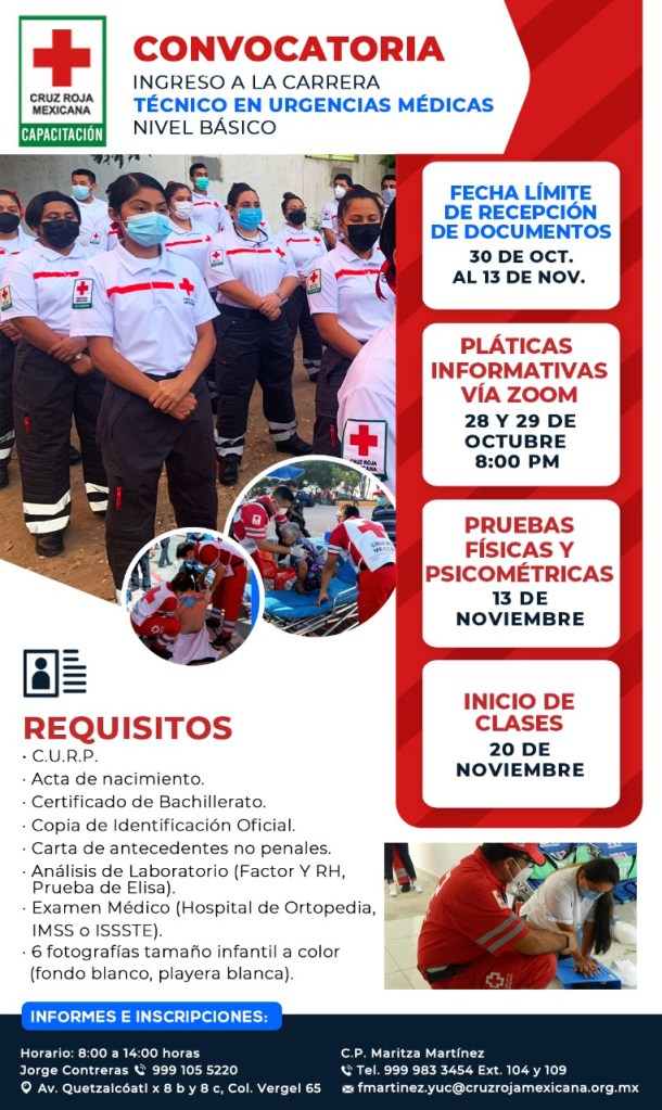 Mérida, Yucatán a 26 de octubre de 2021.- El próximo sábado 20 de noviembre inician las clases para convertirse en Técnico en Urgencias Médicas nivel básico por la Cruz Roja Mexicana Delegación Yucatán por lo que se invita a todos los interesados a inscribirse, informó el Coordinador Estatal de Capacitación, Jorge Contreras Lizama.
