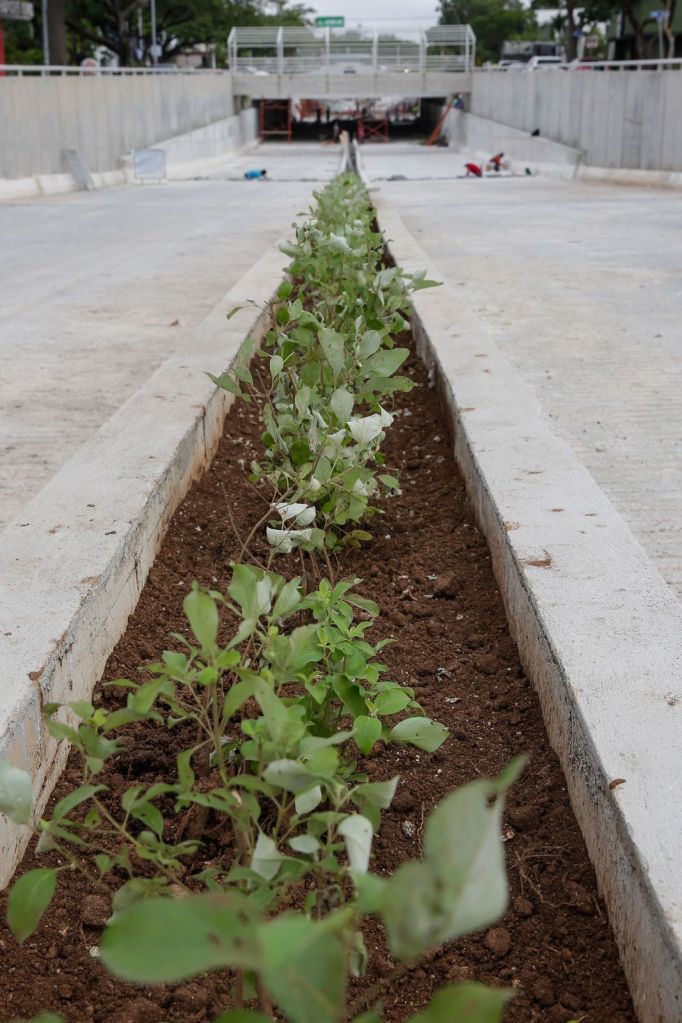 Mérida, Yucatán a 27 de octubre del 2021,- Para mejorar la seguridad al circular por el paso a desnivel de Prolongación de Paseo de Montejo, el Ayuntamiento de Mérida instaló luminarias e infraestructura urbana en la zona.