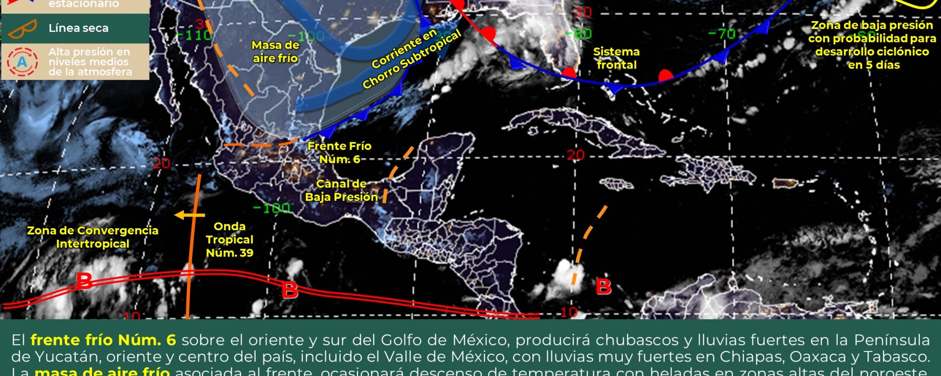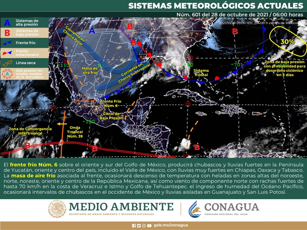 de la región debido a la llegada de una vaguada pre-frontal y posteriormente de la llegada del frente frío No.6. Por lo que se prevén intervalos de chubascos con tormentas localmente fuertes principalmente sobre el norte-centro y oriente de Yucatán, centro y sur de Quintana Roo, así como el sur de Campeche. Por otra parte, se espera que las temperaturas sea calurosas durante el día y de templadas a cálidas al amanecer. Los vientos serán del sur-sureste por la mañana, cambiando gradualmente al norte-noroeste de 15 a 25 km/h y rachas de hasta 50 km/h en las costas de Campeche y Yucatán.