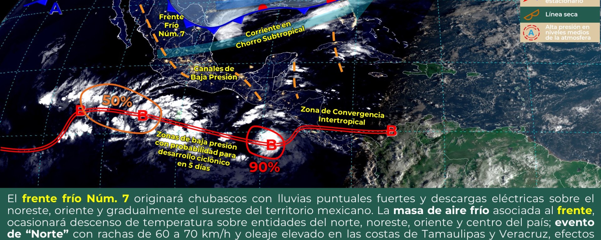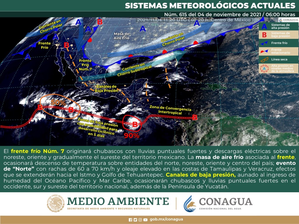 Se prevé que durante este día, el frente frío No.7 recorra el noreste, oriente y sureste del país, aproximándose a la península de Yucatán durante la mañana del viernes, mientras tanto, un canal de bajas presiones
