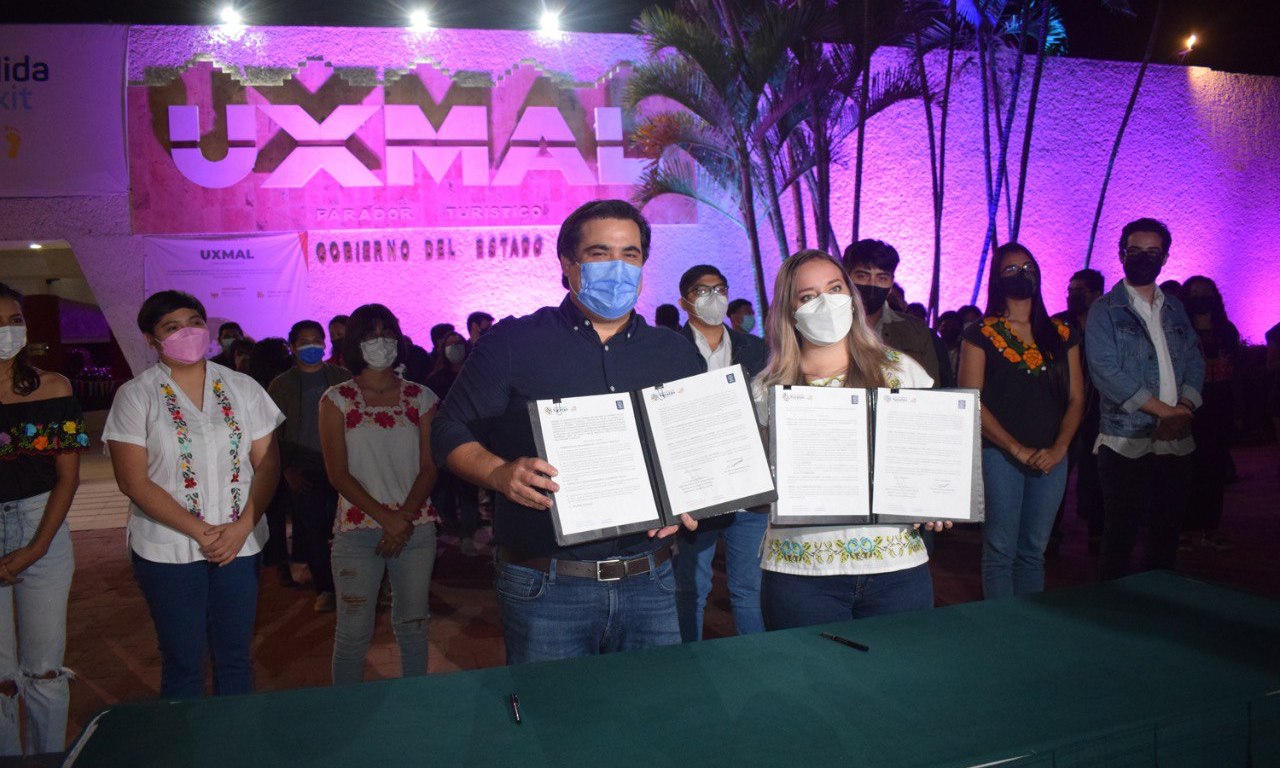 Mérida, Yucatán, a 10 de noviembre de 2021. El director general de Cultur, Mauricio Díaz Montalvo, y Alejandra Mejía Palma, presidenta de la Nueva Federación Universitaria (NFU) de la UADY, firmaron, en Uxmal, un convenio de colaboración, mediante el cual la dependencia les otorgará descuentos y otras facilidades para que sus agremiados accedan a los sitios que administra y los segundos apoyen en la promoción de los mismos con diferentes estrategias de divulgación.
