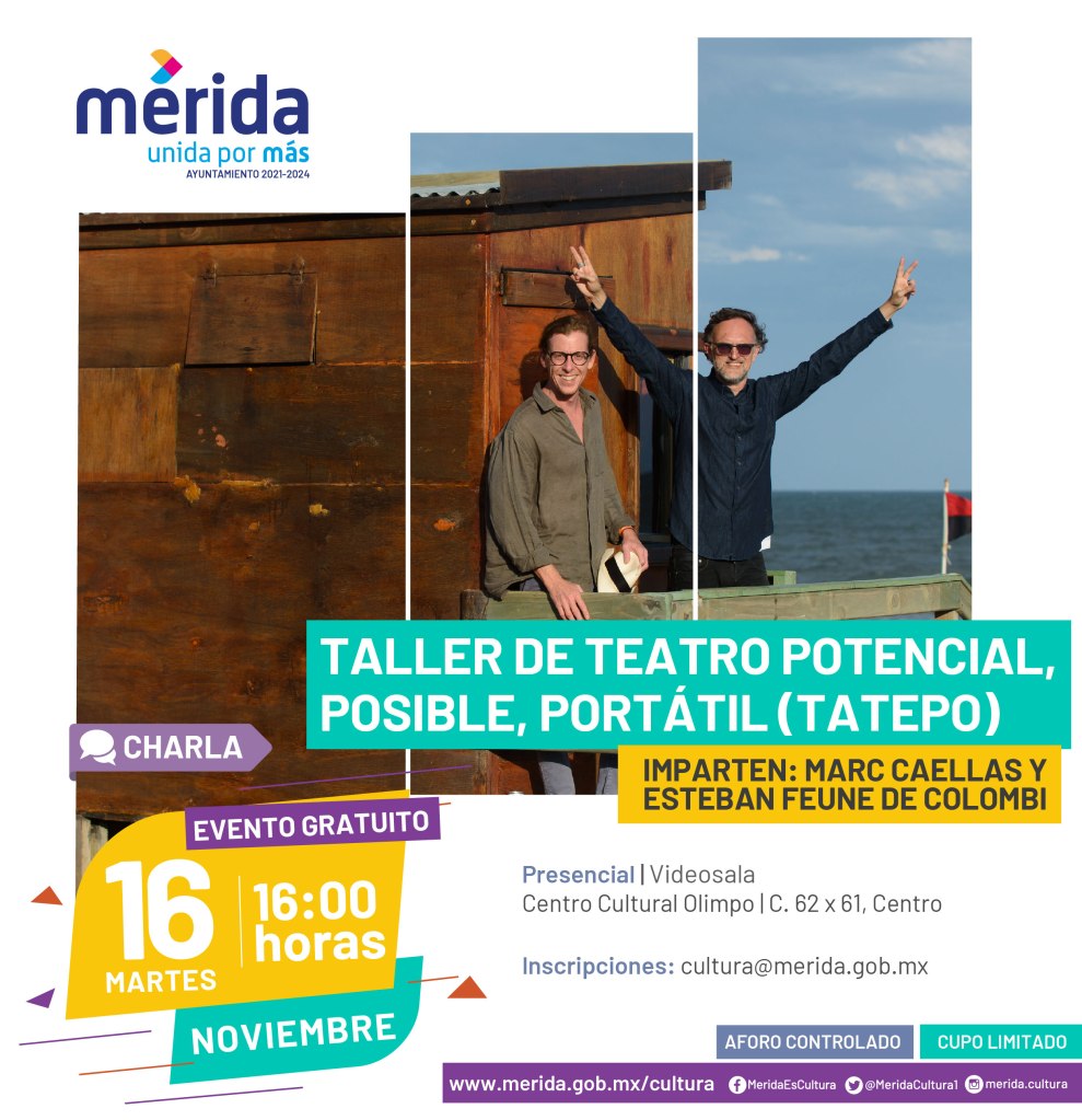 Por otro lado, el artista español Marc Caellas y el argentino Esteban Feune de Colombi traen a Mérida la Charla-Taller de Teatro Potencial, Posible, Portátil (Tatepo), para el martes 16, en la Videosala del Olimpo, de 16:00 a 20:00 horas. El taller ofrece herramientas para activar puestas en escena, obras, plataformas, ideas, performances, happenings, espectáculos y proyectos para todo tipo de escenarios (abiertos o cerrados, fijos o móviles). Está dirigido a músicos, performers, escritores, actores, pintores, escultores y artistas sea cual fuere su disciplina. Es gratuito y al correo cultura@merida.gob.mx se reciben las inscripciones.