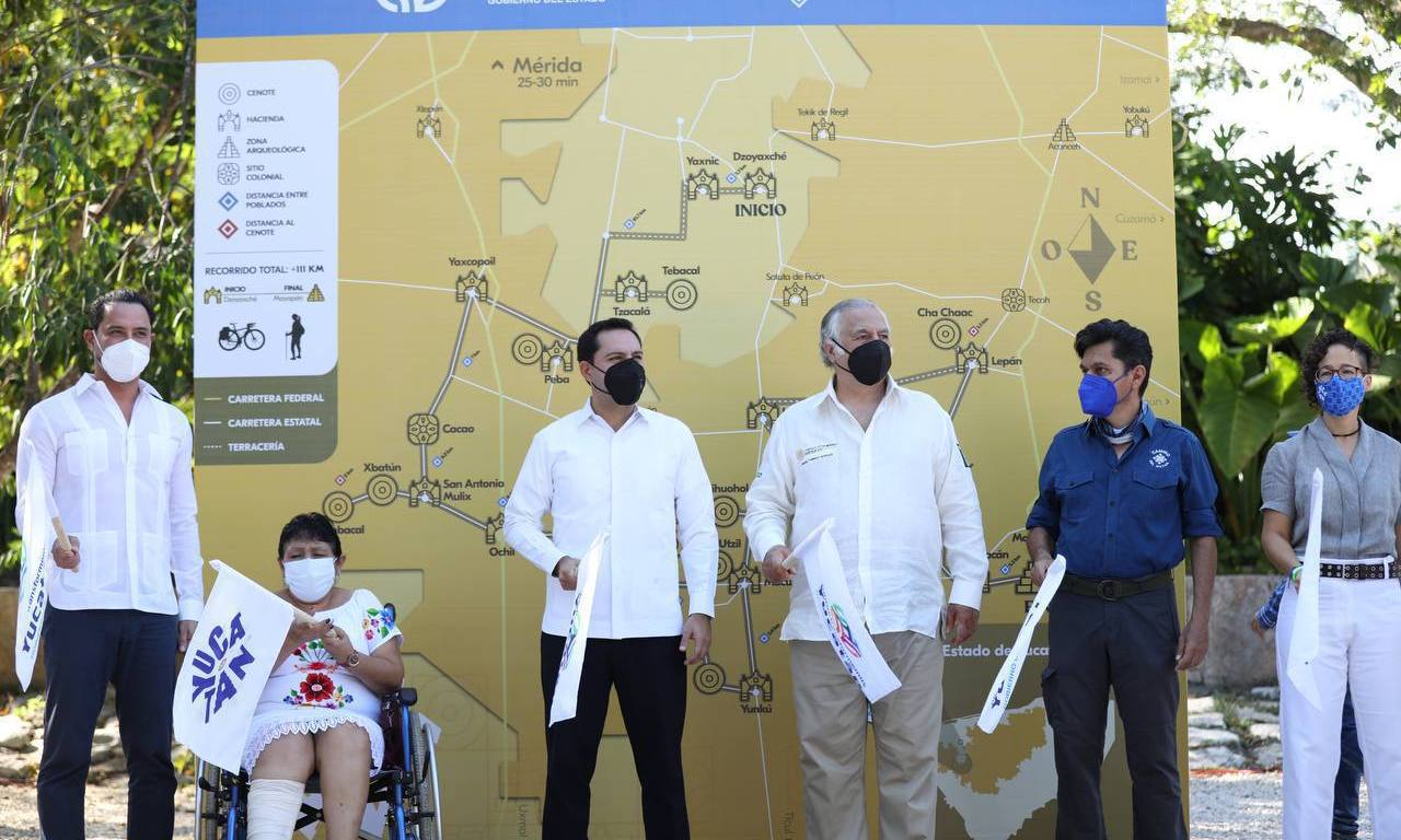 Momentos antes, el Gobernador y el secretario federal encabezaron la presentación del Camino del Mayab, que integra una red de más de 100 kilómetros de bellas y antiguas rutas, con valor histórico y natural; inicia desde Dzoyaxché y culmina en Mayapán, abarcando 14 comunidades que trabajan en equipo, uniendo más de 30 puntos, entre cenotes, aldeas, haciendas, reservas ecológicas y, sobre todo, la calidez del pueblo maya, para descubrir la esencia de su vida y cultura.