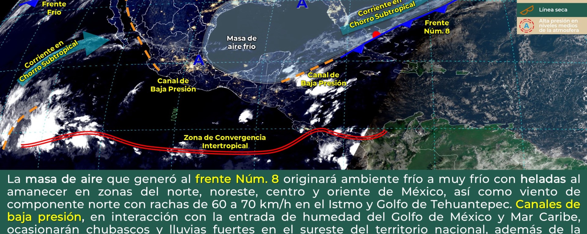 Una masa de aire frío sobre la península de Yucatán, así como una vaguada sobre el sureste de la región, mantendrán condiciones de cielo medio nublado con probabilidad para lluvias fuertes a muy fuertes en el estado de Quintana Roo, chubascos dispersos al sur de Yucatán, así