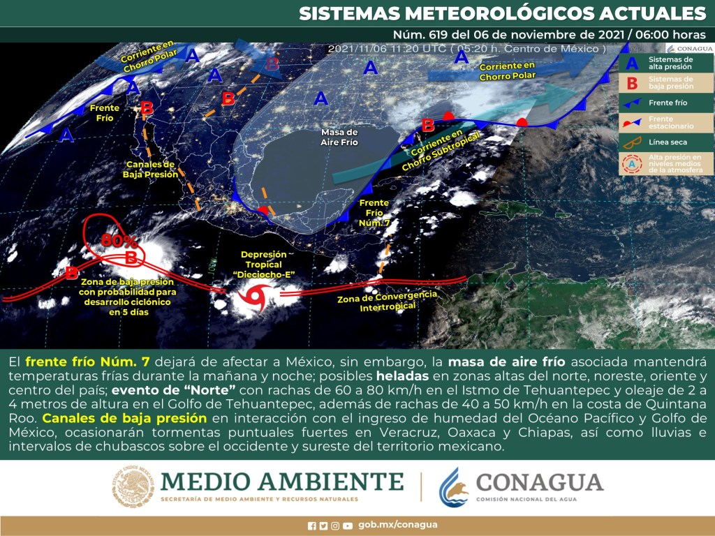 El frente No. 9 se localizará con características de estacionario al norte de la península de Yucatán, su vaguada inducida propiciará intervalos de chubascos con lluvias puntuales fuertes en el oriente y noreste de Yucatán, sur y suroeste de Campeche, así como a lo largo del estado de Quintana Roo.