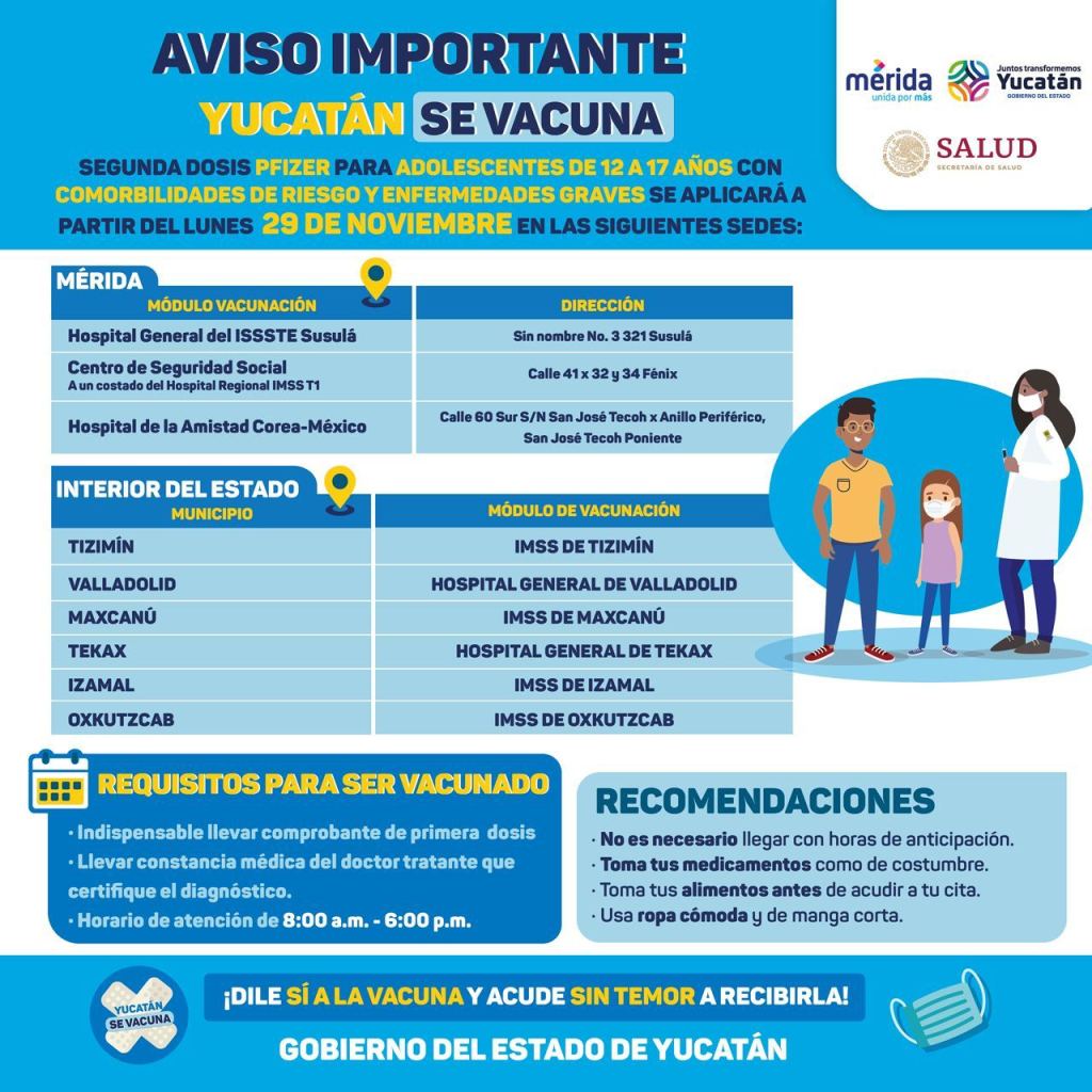 Mérida, Yucatán, 21 de noviembre de 2021.- Adolescentes de 12 a 17 años de edad con comorbilidades de riesgo y enfermedades graves recibirán, del próximo 29 de noviembre al 1 de diciembre, la segunda dosis contra el Coronavirus en Mérida y 6 municipios del interior del estado, con lo que el proceso de vacunación en Yucatán no se detiene y continúa avanzando de forma favorable, informó la Secretaría de Salud (SSY).