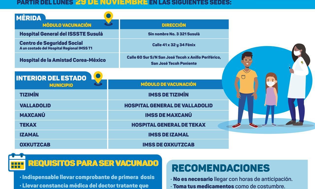 Por disposición del Gobierno federal, la vacunación de este sector de la población se llevará a cabo en Mérida, en los hospitales Susulá del Instituto de Seguridad y Servicios Sociales de los Trabajadores del Estado (Issste) y de la Amistad Corea México de la Secretaría de Salud de Yucatán (SSY), así como en el Centro Social del Instituto Mexicano del Seguro Social (IMSS), ubicado a un costado del Hospital General Regional “Lic. Ignacio García Téllez”, mejor conocido como T-1.
