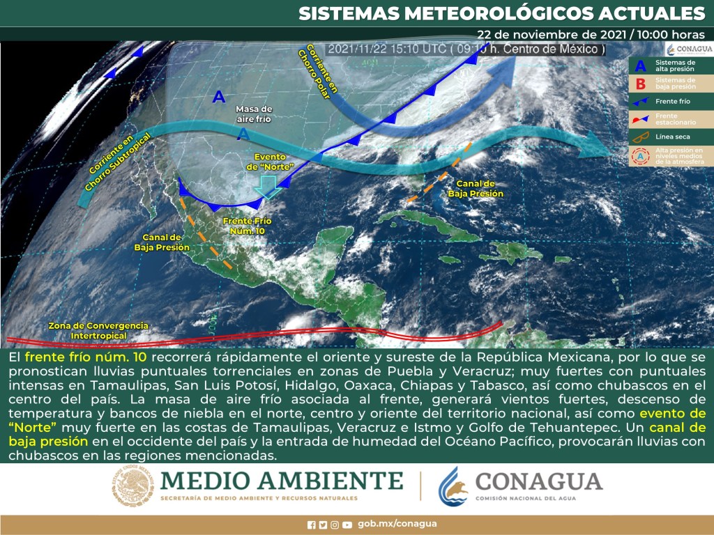 lloviznas con intervalos de lluvia sobre la porción noreste, oriente y sur de Yucatán. Temperaturas cálidas a calurosas durante el día y templadas a cálidas al amanecer. Viento de dirección norte-noreste de 15 a 25 km/h y rachas mayores a 40 km/h en zonas costeras. Por otra parte, el frente frío No.10, se extenderá sobre la porción
